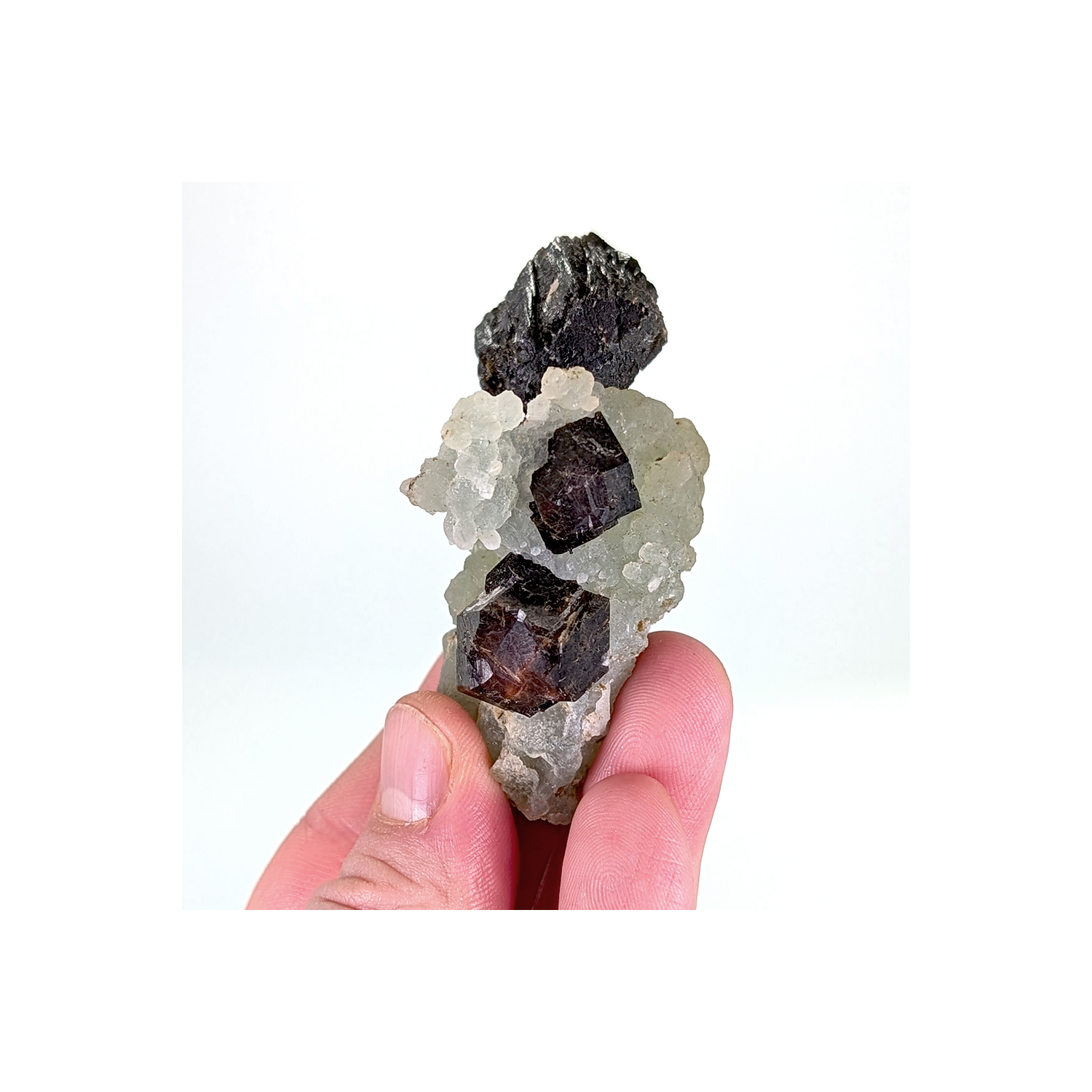Here is an interesting specimen, featuring a triple association of prehnite, garnet, and epidote, and bearing the imprint of a garnet (obtained through perimorphism) that is now lost.