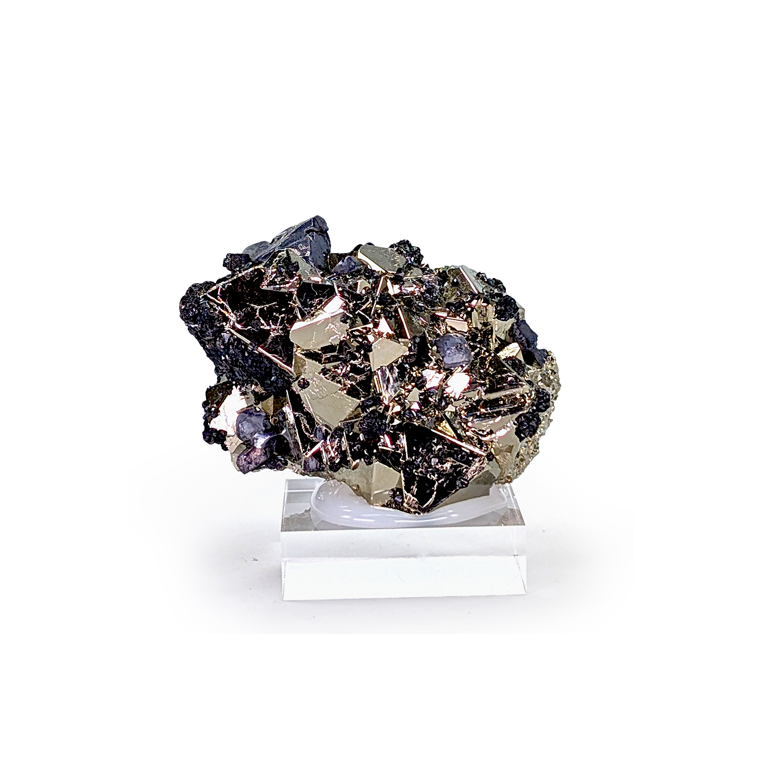 A striking combination of brilliant octahedral pyrite with black sphalerite flecks and "melted" galena crystals.