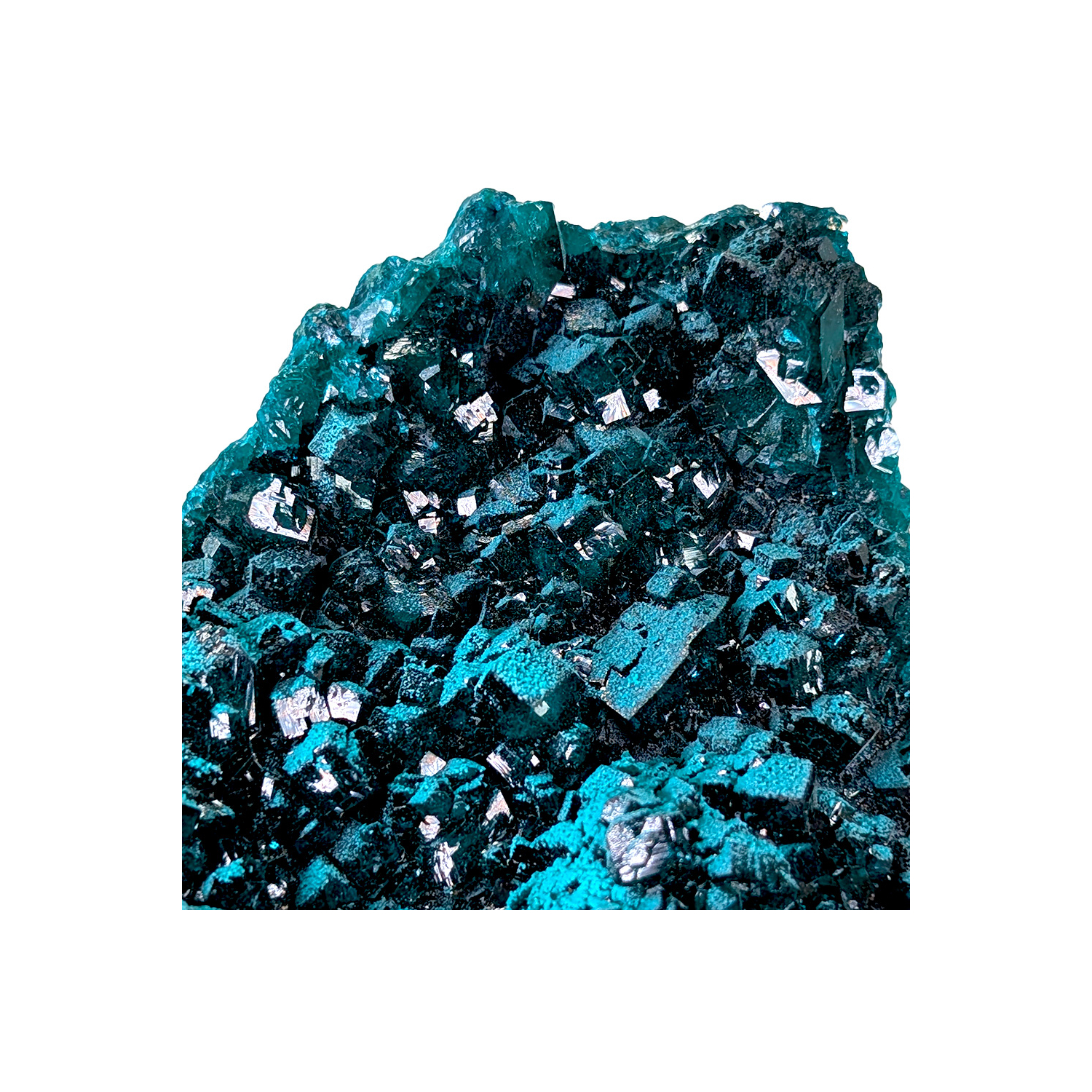 A beautiful, brightly colored dioptase slab with a volume created by partial overlapping of the crystals.