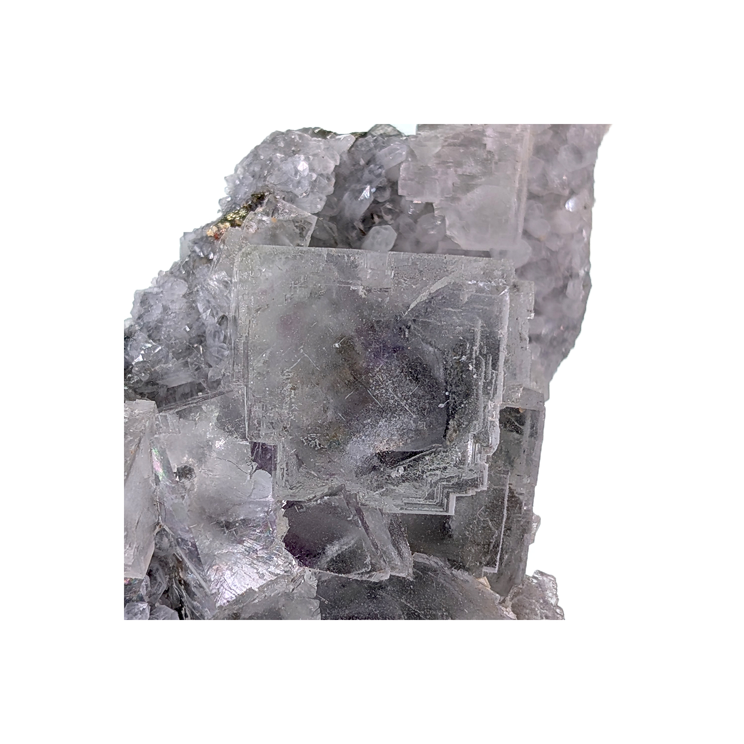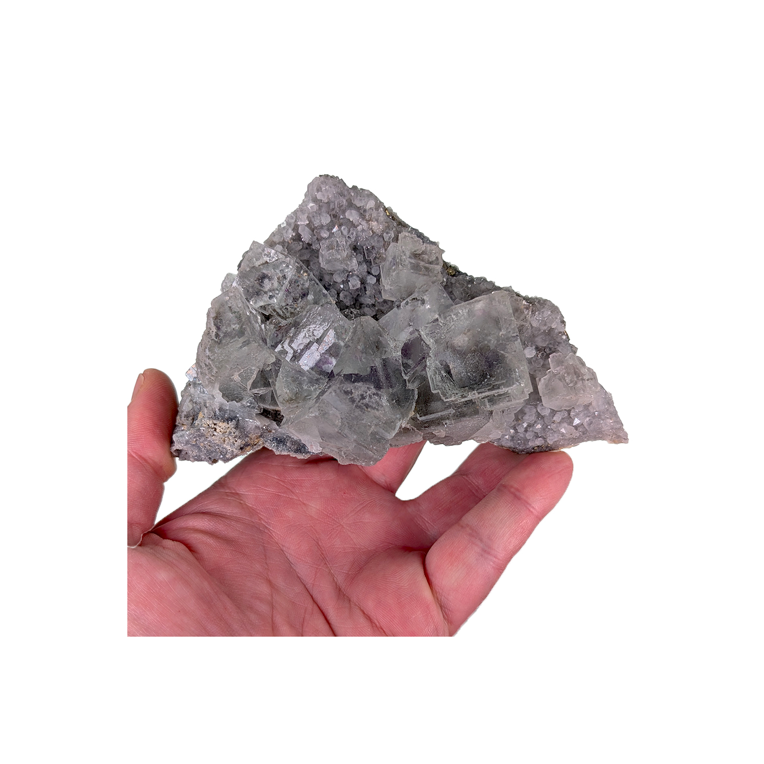 A beautiful antique fluorite on quartz and pyrite, with well-defined cubic crystals and a subtle pale green hue.