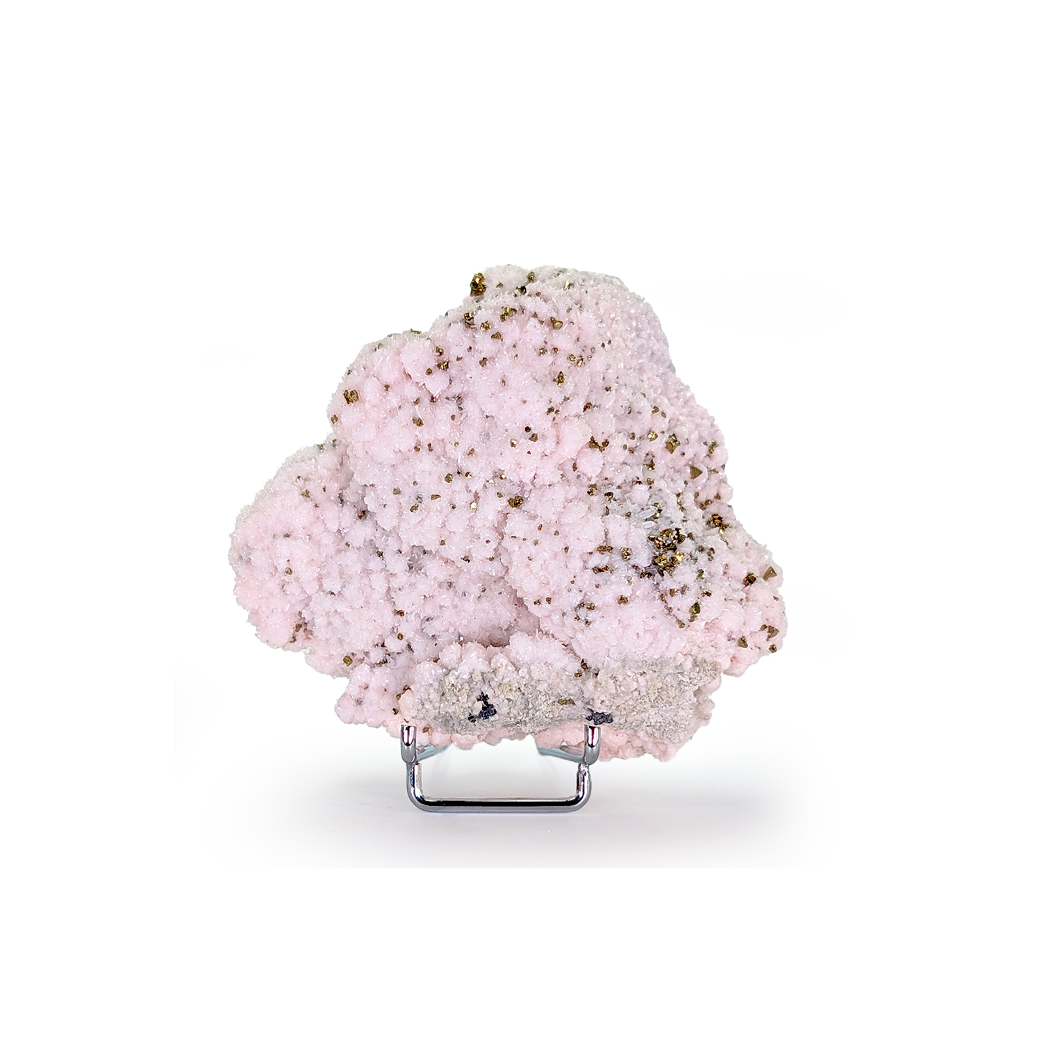 Manganocalcite with a light color, covered with small pyrite crystals, on a sphalerite-rich matrix.