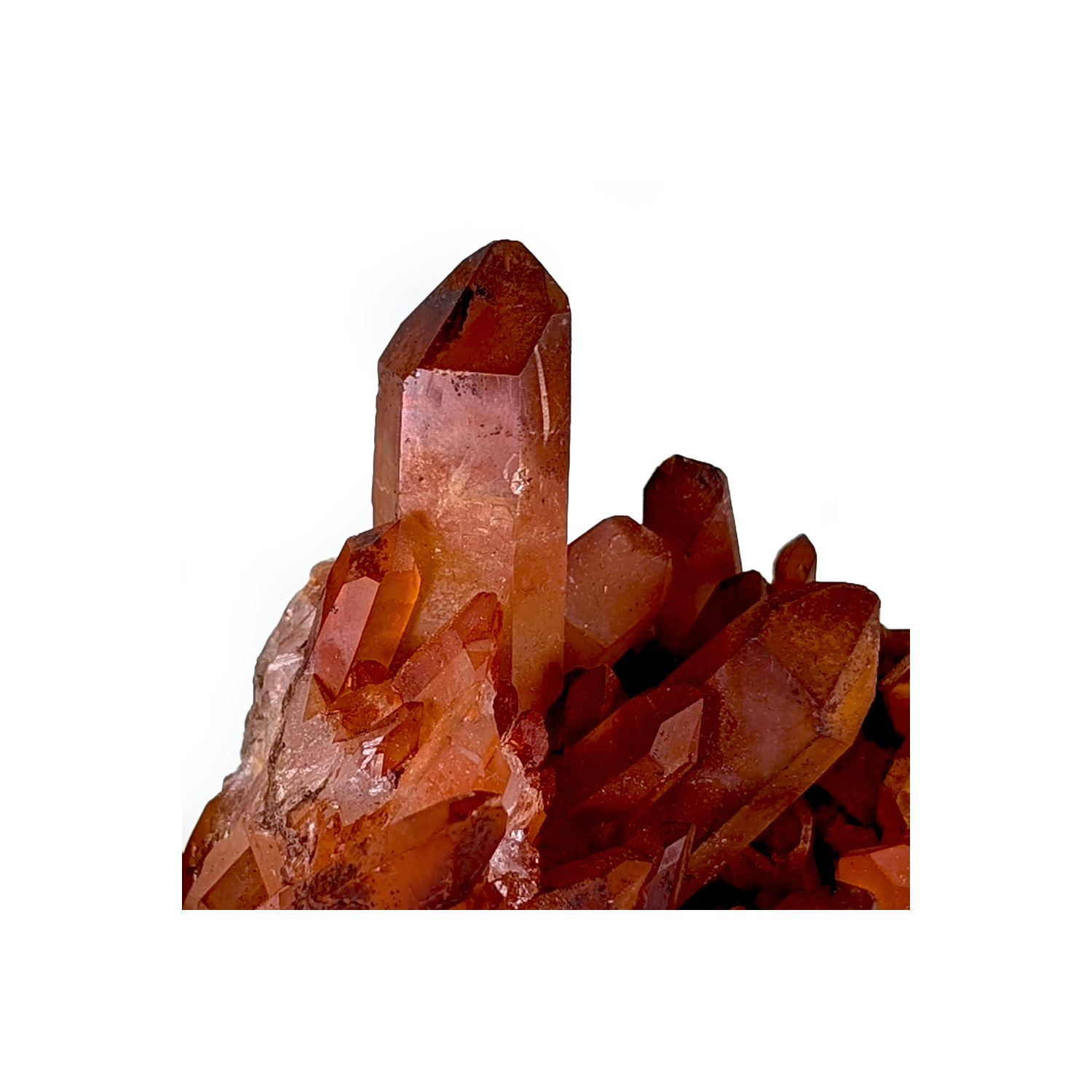 A group of quartz crystals known as "mandarin," named for its surface color caused by oxides. Note that some points are missing.