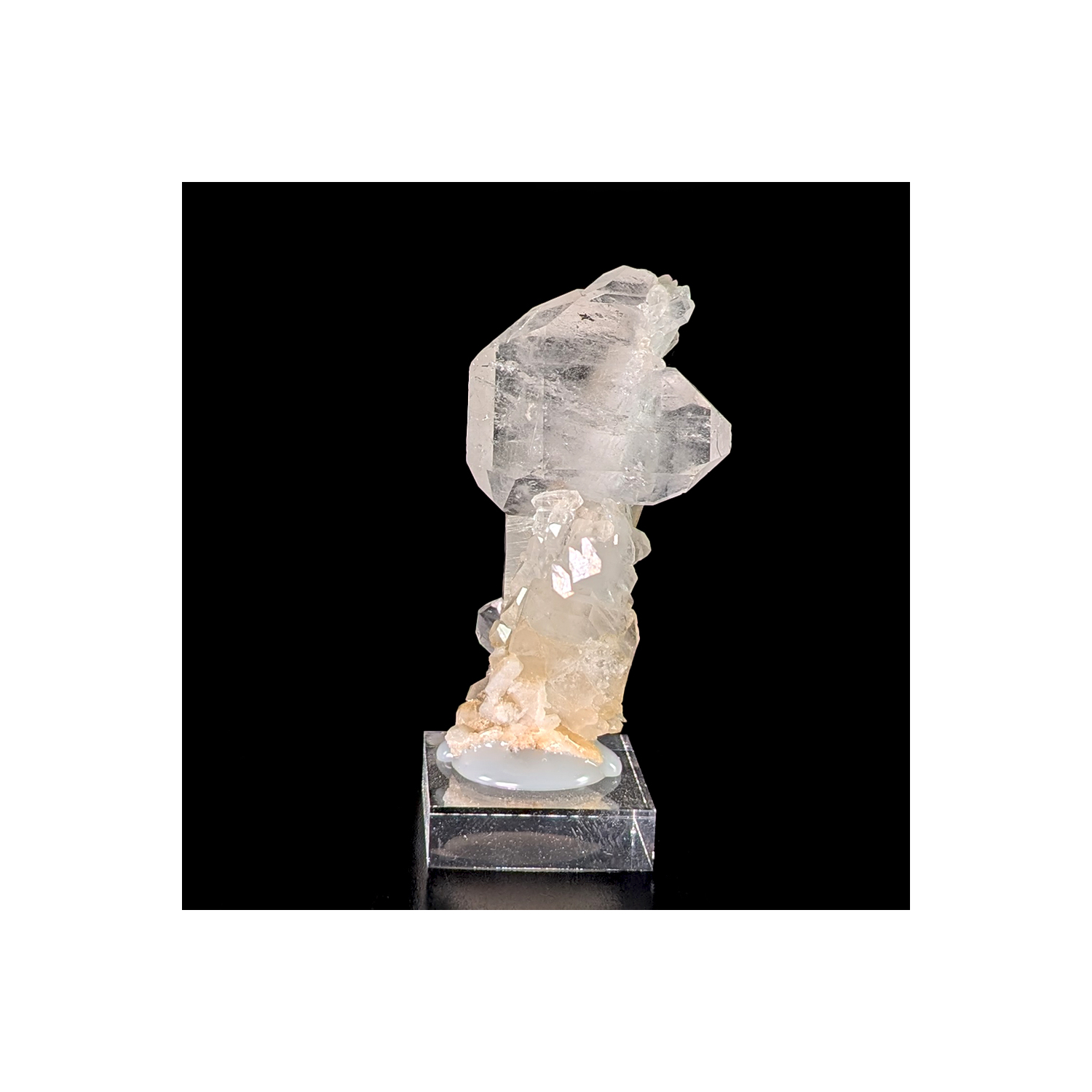 Flat quartz crystal with a core, supported by a column of smaller crystals.