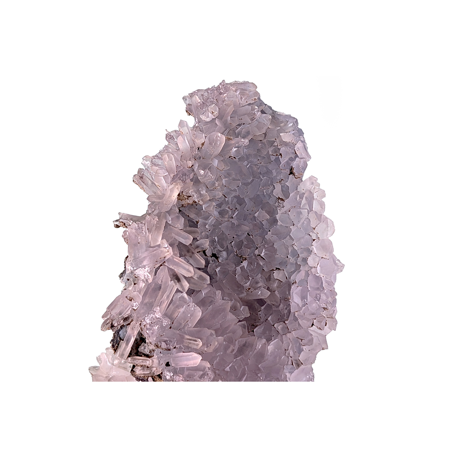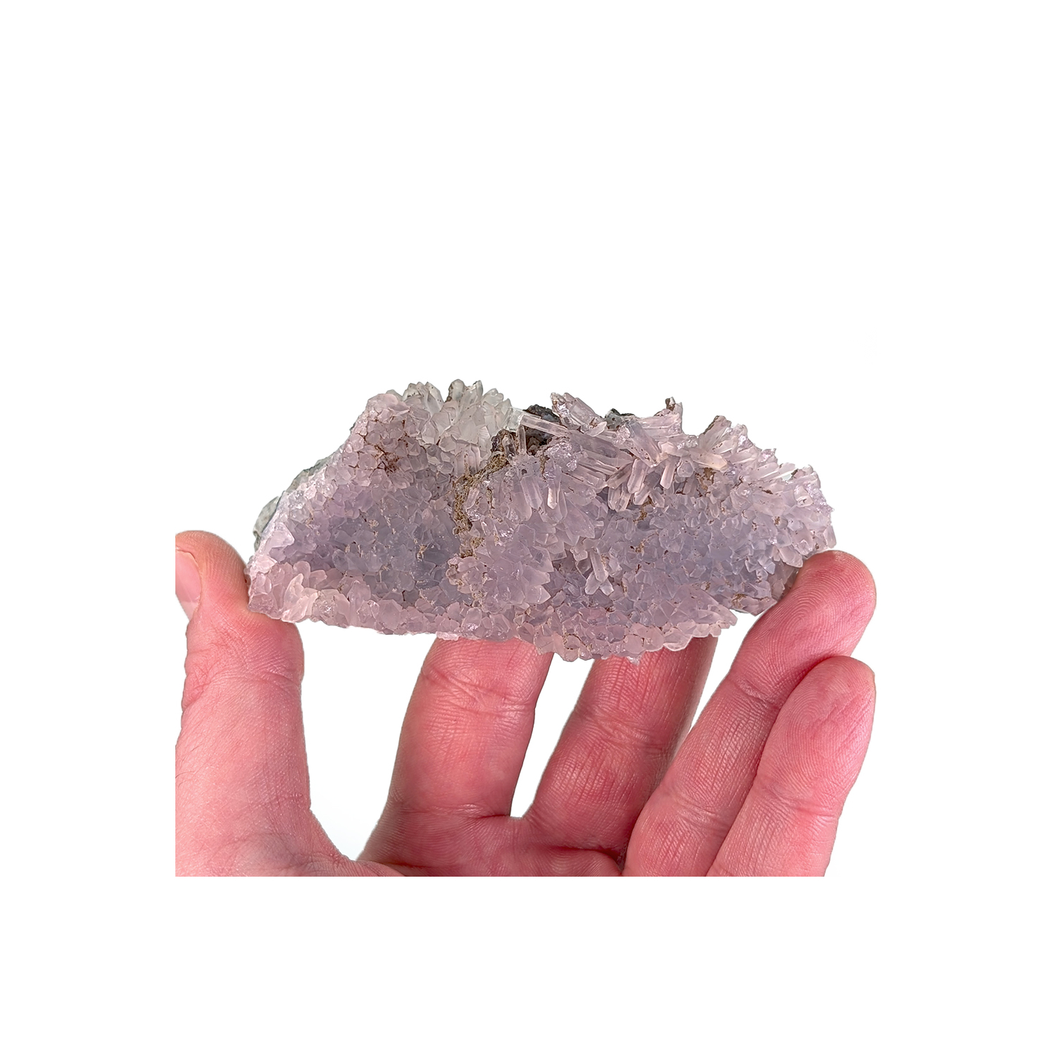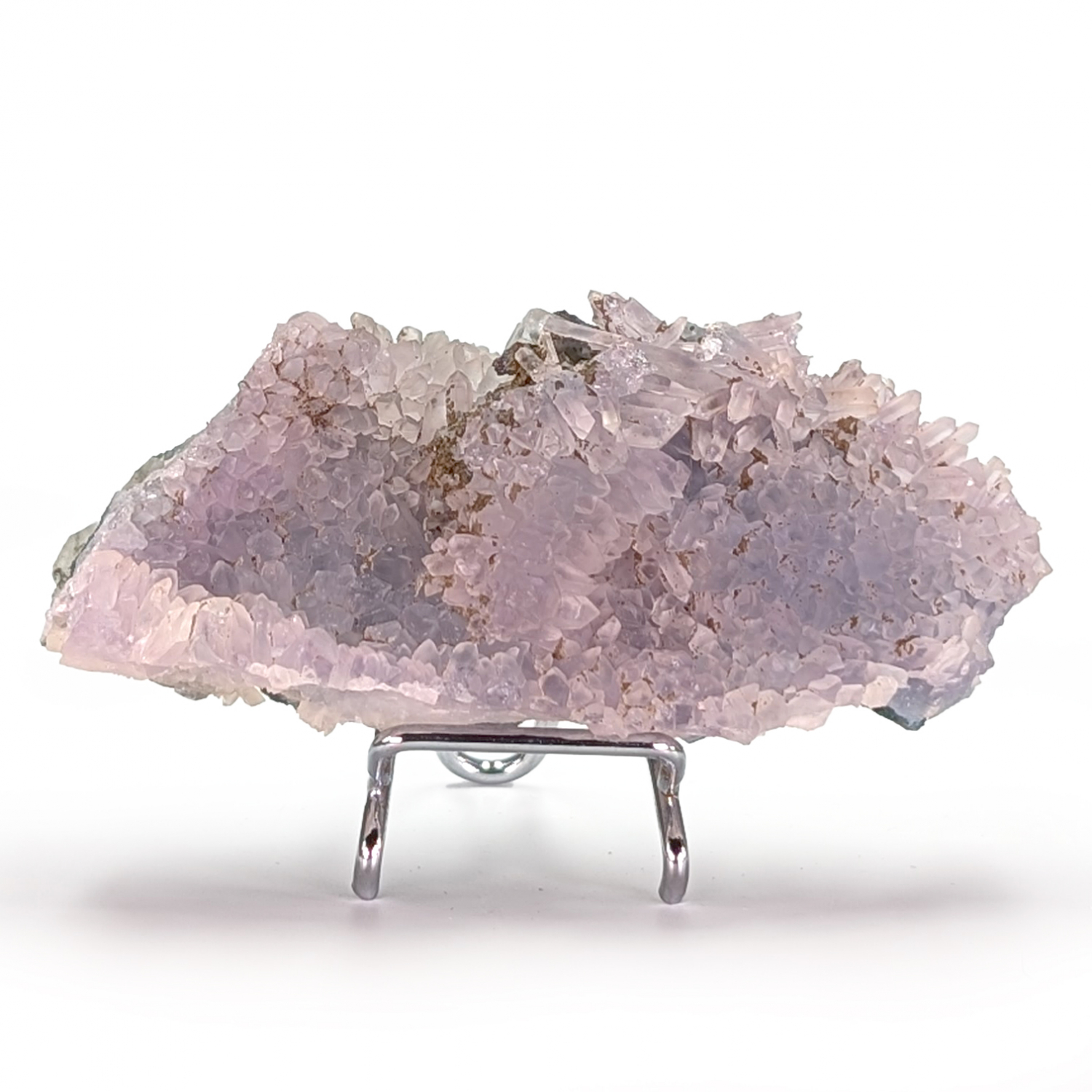 Amethyst specimen with fine, prismatic, lavender-colored crystals, accompanied by calcite crystals on the back.