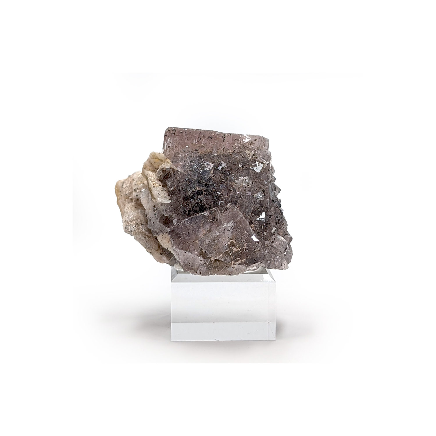 A pleasing specimen, featuring a purple fluorite with a yellow center, accompanied by barite and pyrite inclusions.