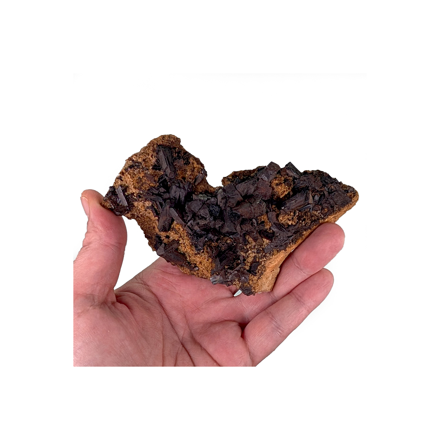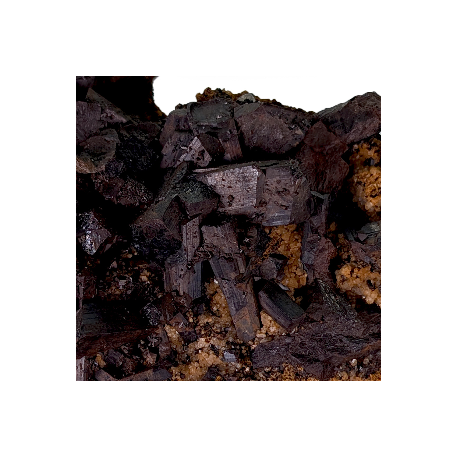 An old slab of ilvaite, a silicate mineral, containing crystals over one centimeter in size. The prismatic, striated crystals are rust-brown in color.