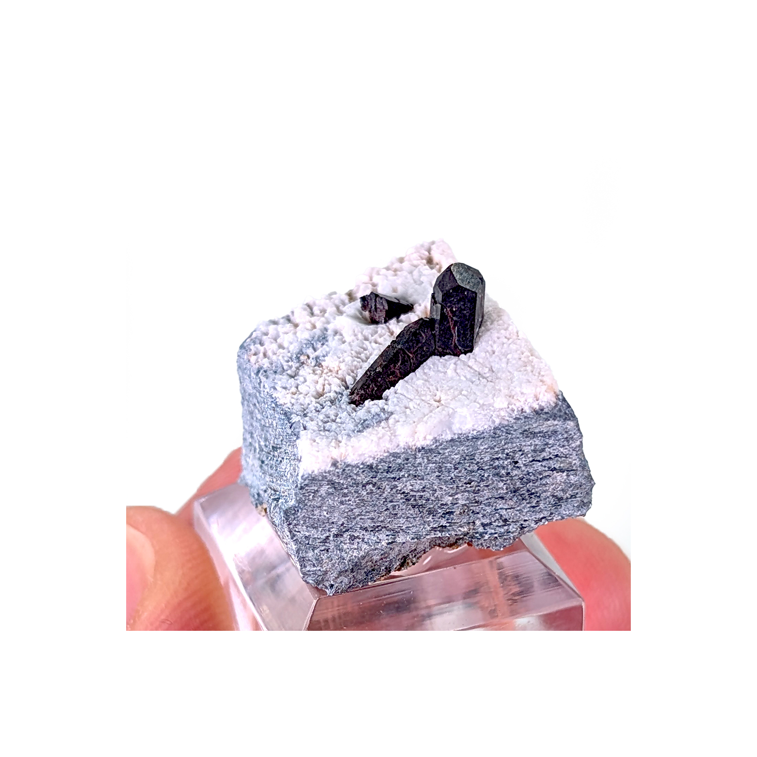 Neptunite crystals on natrolite, the largest of which is terminated.