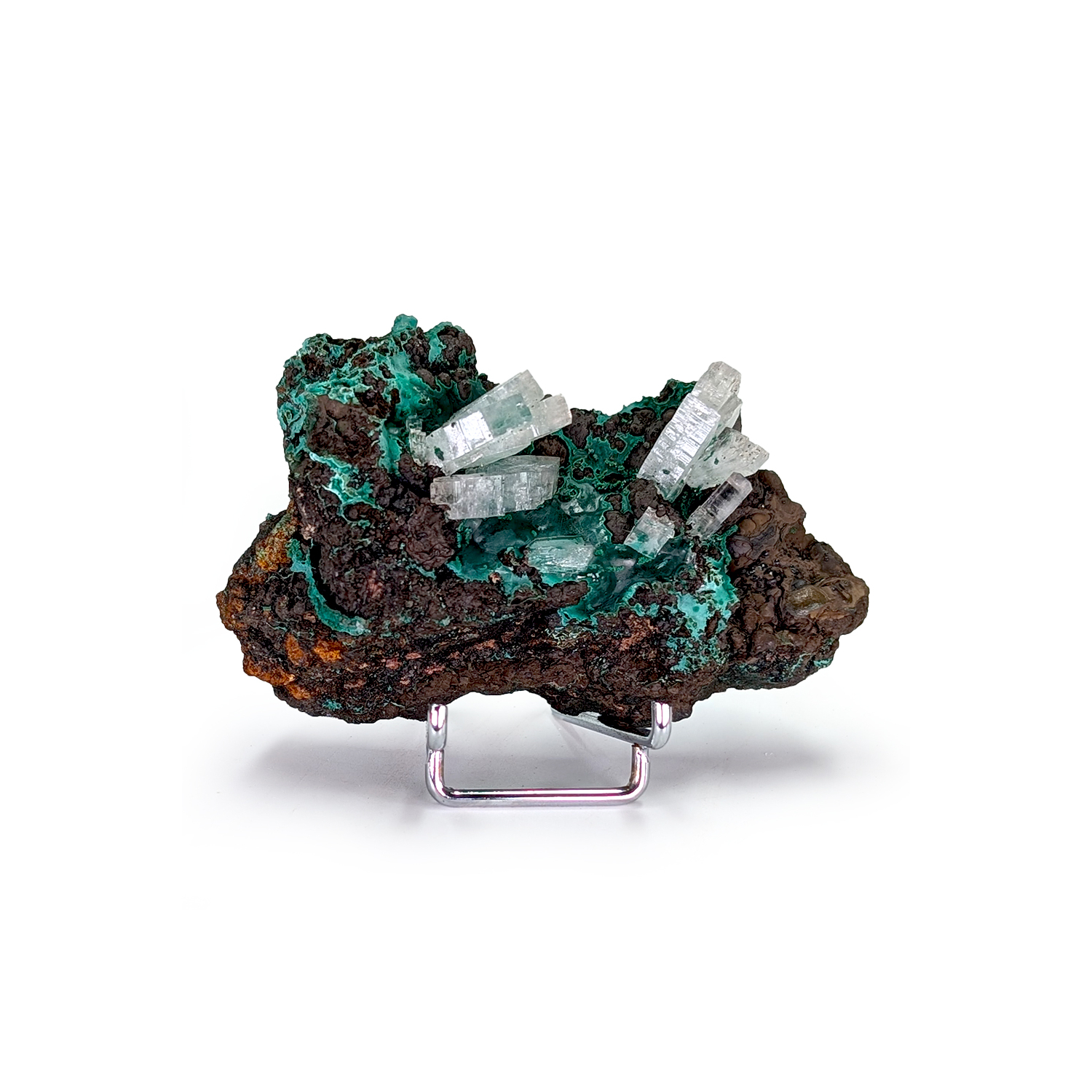 An interesting mineral featuring blue, terminated barite crystals on a malachite deposit.