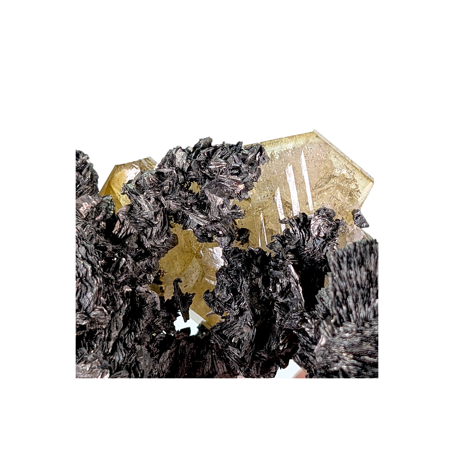 An elegant classic of Moroccan mineralogy, featuring yellow barite crystals suspended between flaky marcasite crystals.