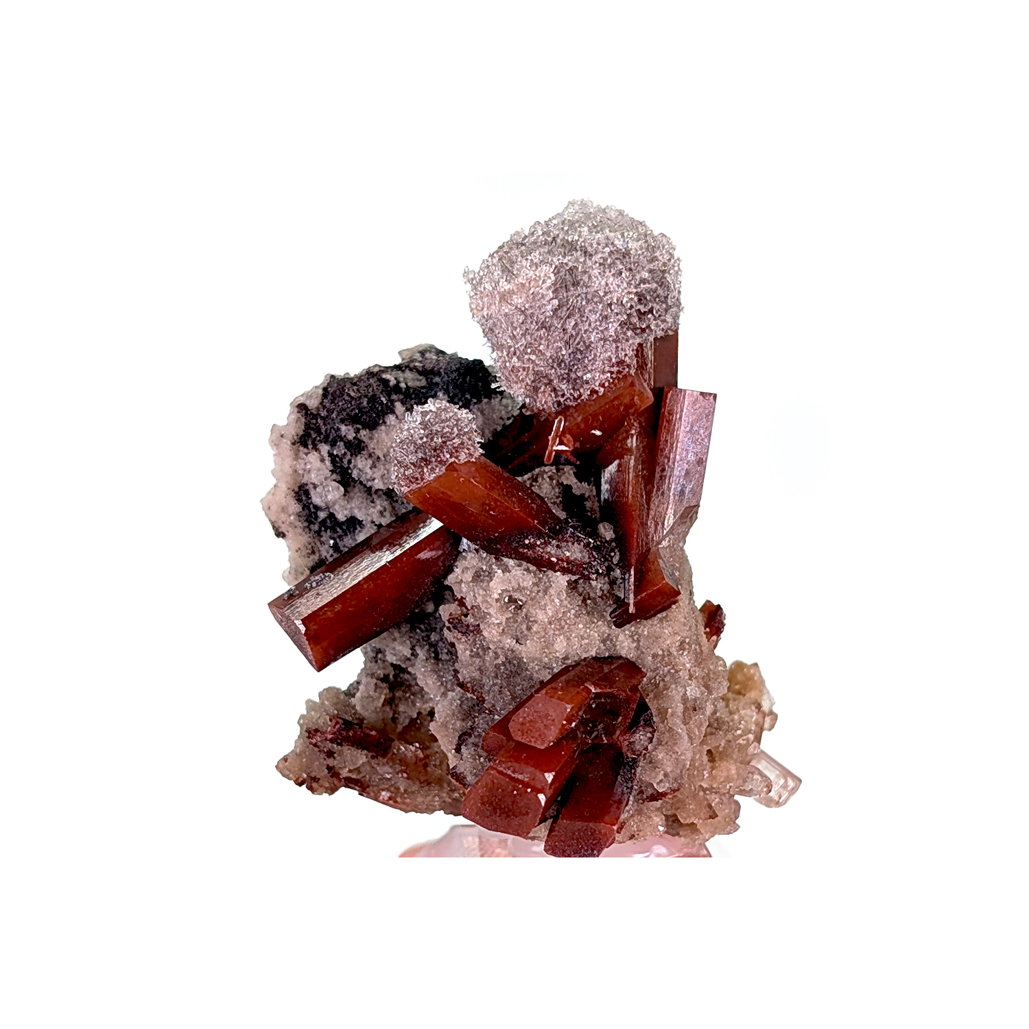 This is an aesthetically pleasing arrangement of terminated red topaz crystals, accompanied by hyalite opal concentrated at the top.