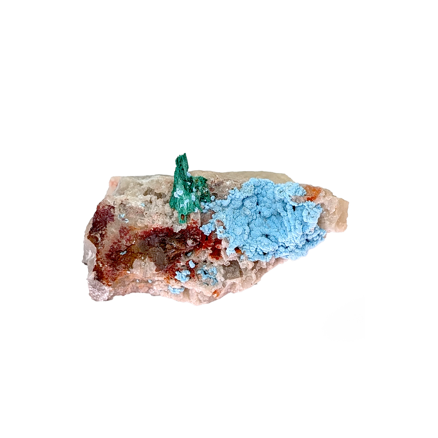 A small but interesting specimen combining a cluster of malachite and shattuckite on a matrix of rough quartz.