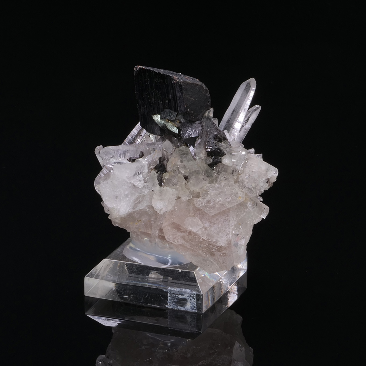 Very beautiful crystals of black Hubnerite with red brick reflections on Quartz offering a nice contrast. Specimen from the Mundo Nuevo mine in Peru.