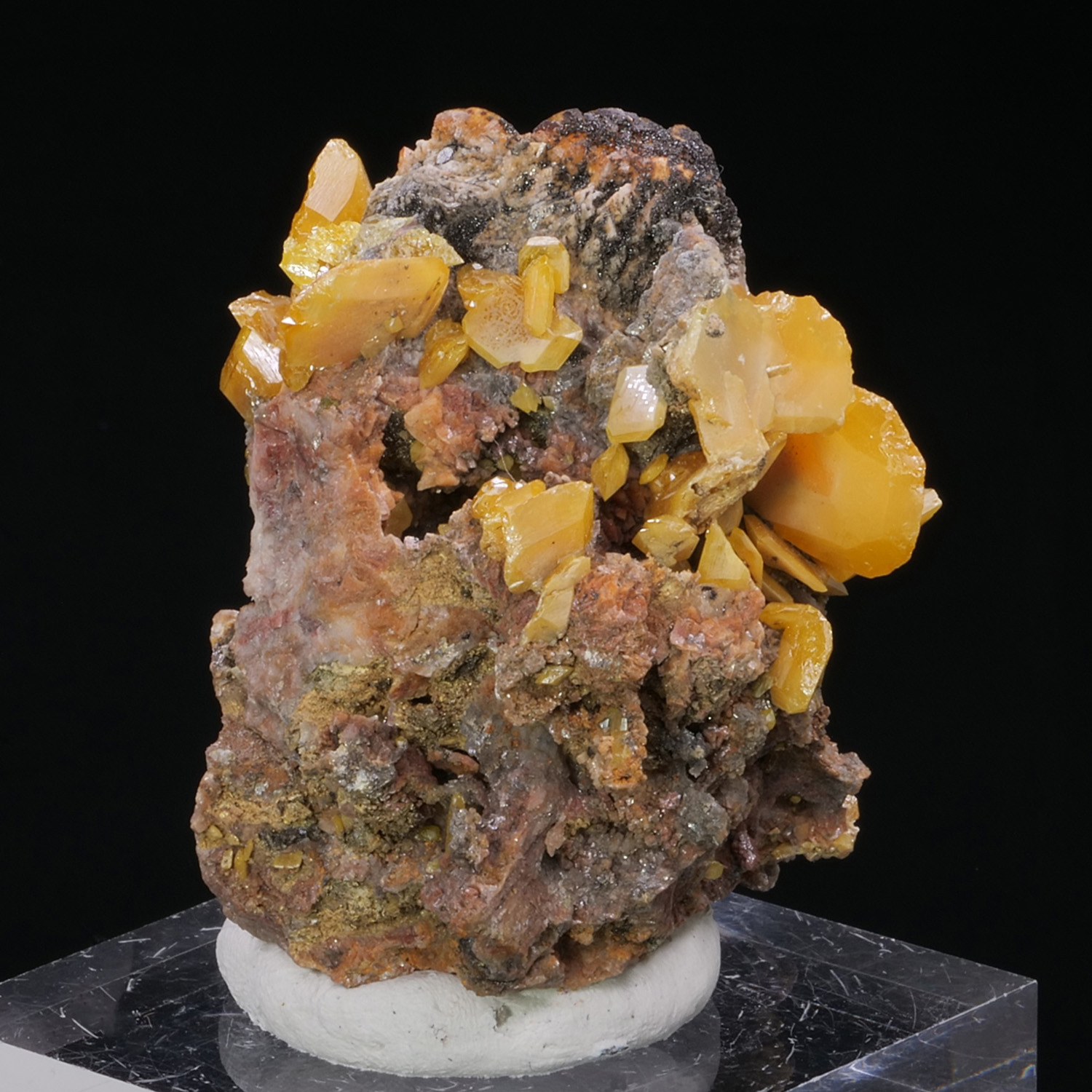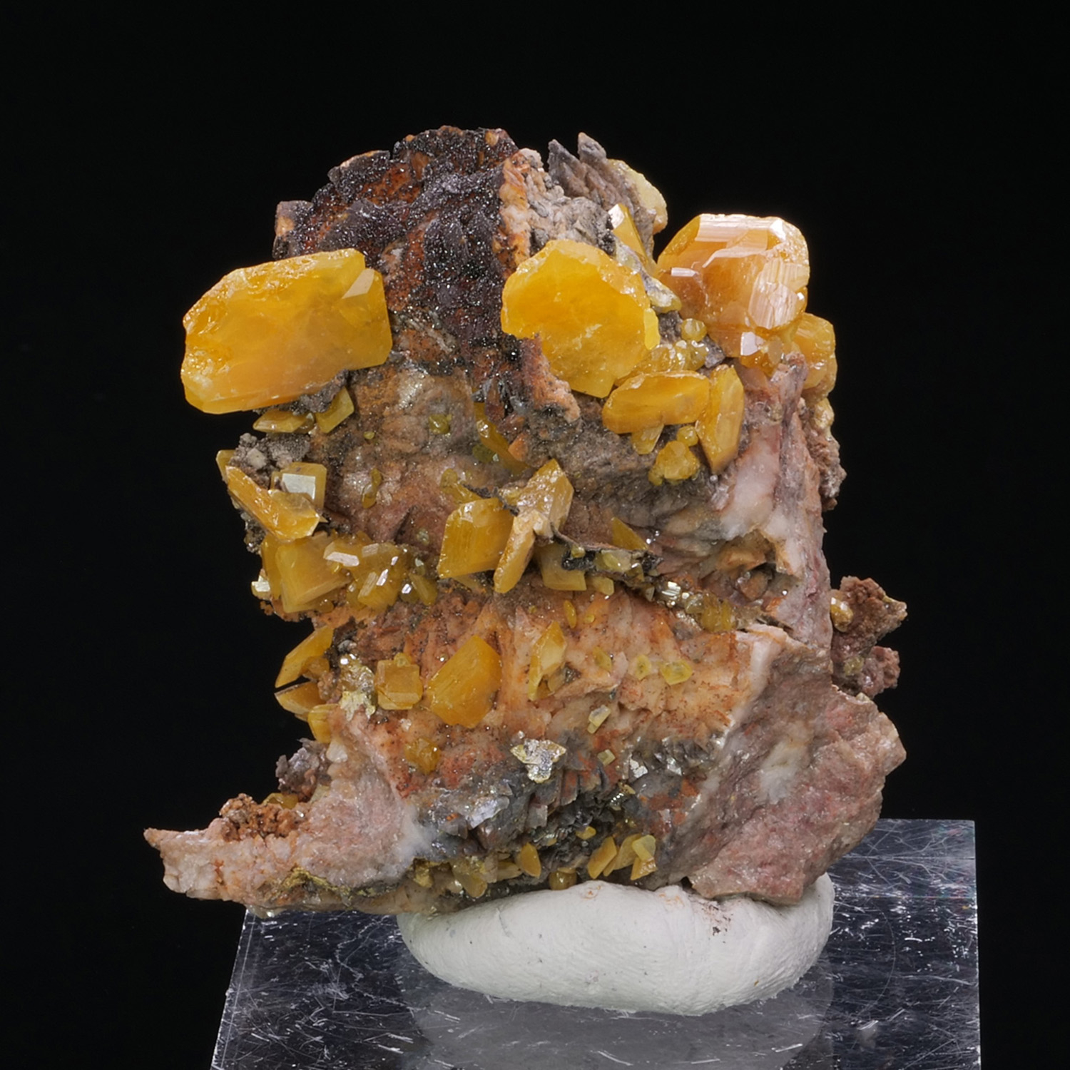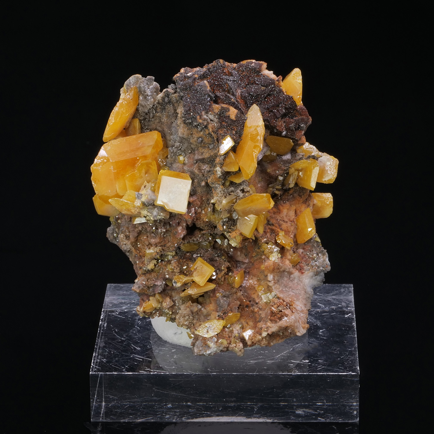 Numerous Wulfenite crystals presenting a superb fire color, intense and brilliant orange. Beautiful quality for this specimen from Touissit in Morocco.