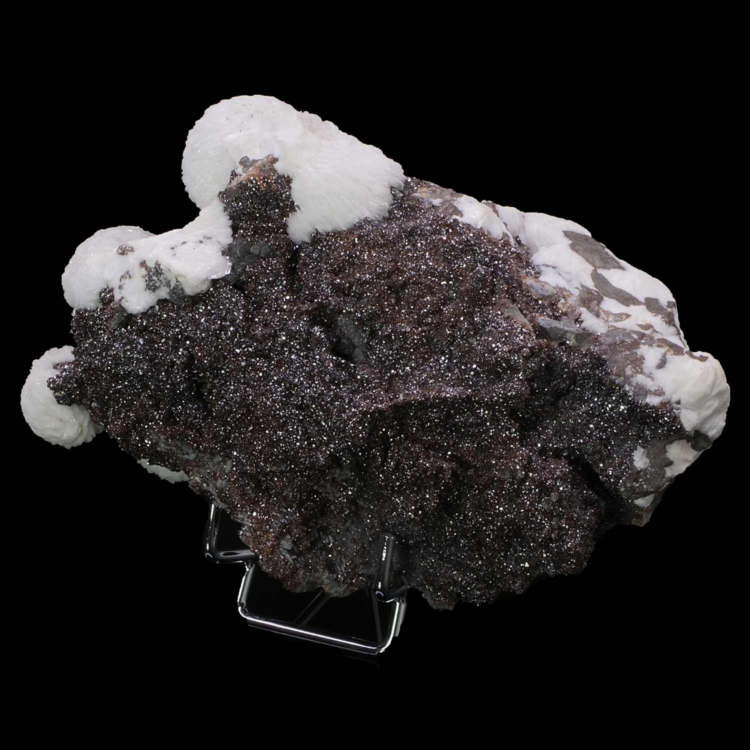 White Baryte pompoms, very bright and well formed, associated with Sphalerite in very dark red orange crystals from the Cedres in France.