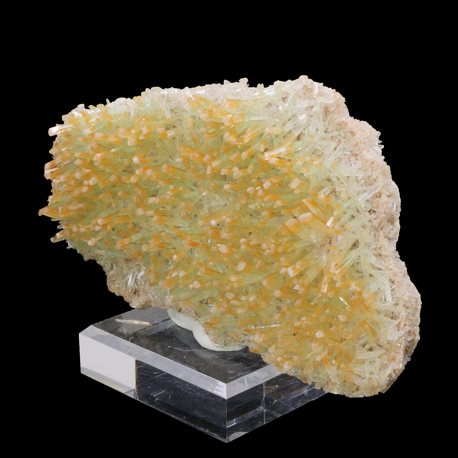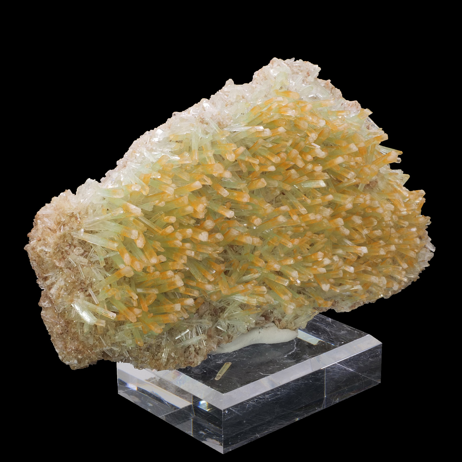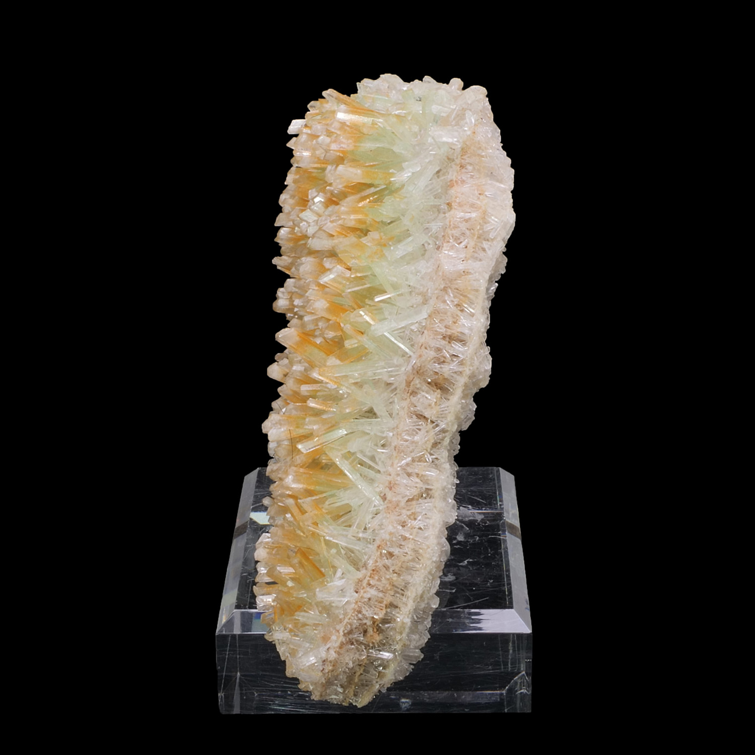 Four layers of gypsum make up this specimen from Pernatty Lagoon in Australia, the layers are delimited by a thin matrix. The first is high in color with orange at the tips and green at the base. Those in the middle are colorless, with crystals in the same direction as the first layer. The fourth layer is also colorless but the crystals go in the opposite direction of the others. Superb training and beautiful quality for this Gypsum.