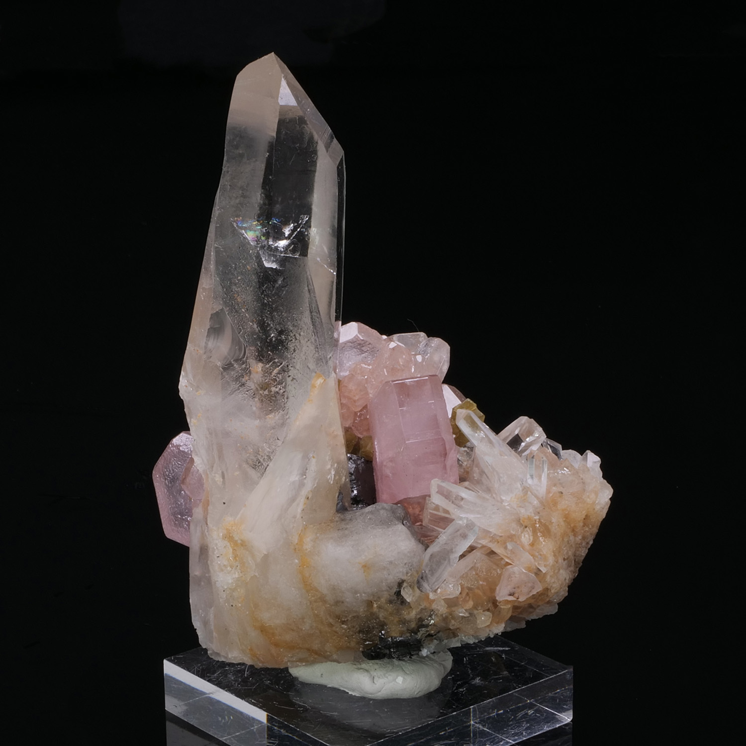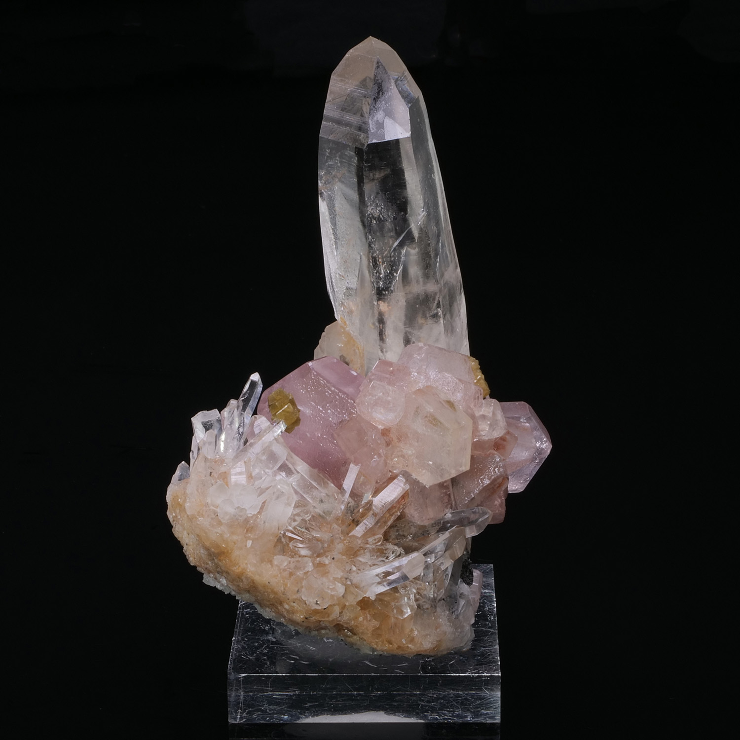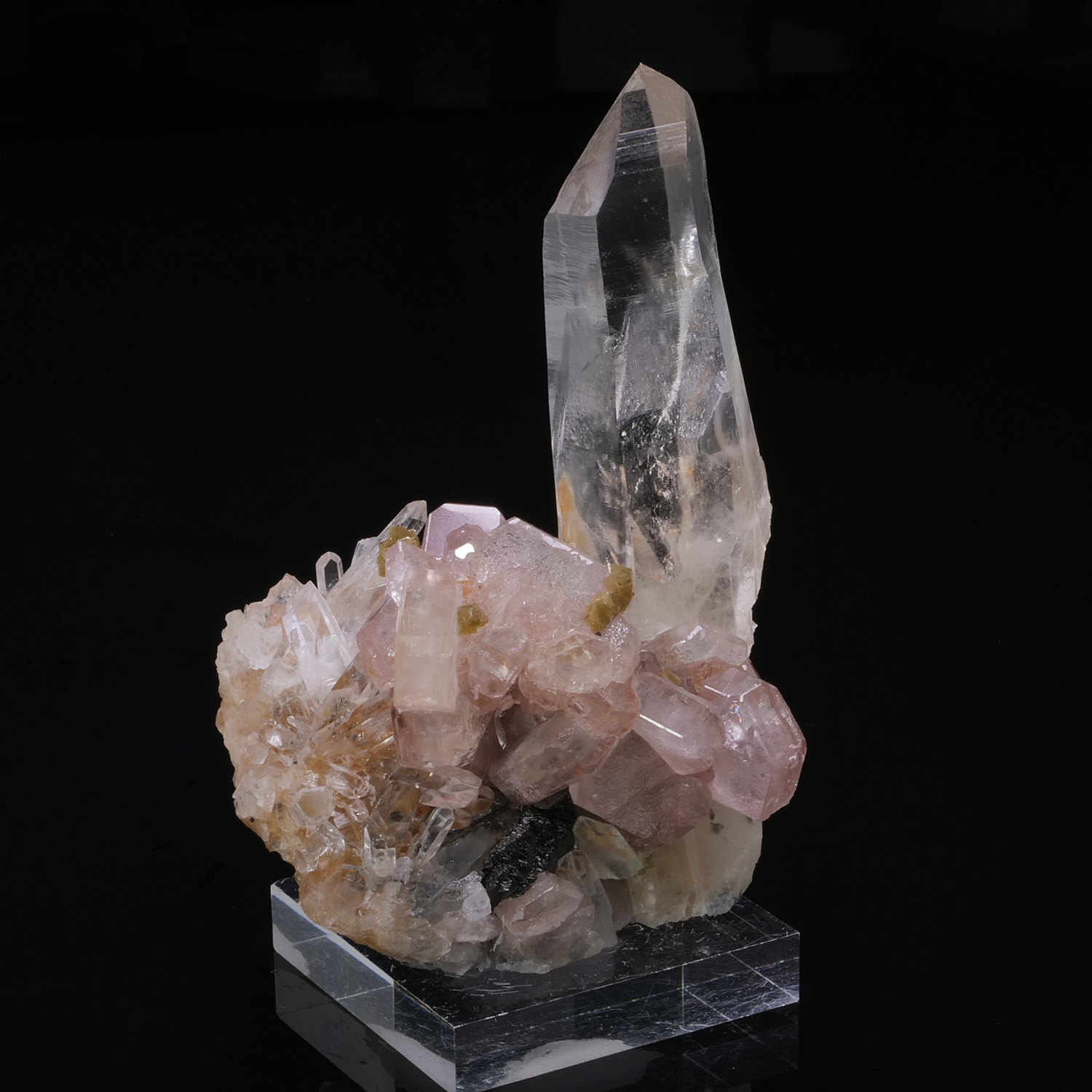 These Fluorapatite crystals are superbly formed, the edges are sharp and the color is intense. They are associated with Quartz, including a very imposing one, Silica, the golden yellow crystals which are also very well formed, as well as Ferberite, black and shiny crystals. The video is a must-see because the architecture of the piece is fascinating, crystals are present everywhere. This piece comes from the Kami mine in Bolivia. This specimen has undergone some minor repairs (less than 2 percent of the specimen).