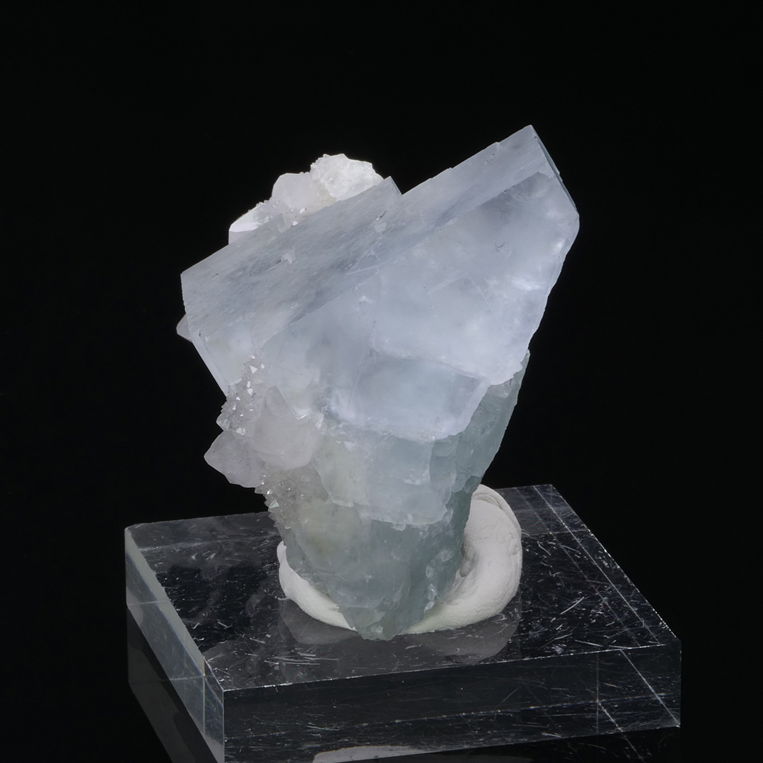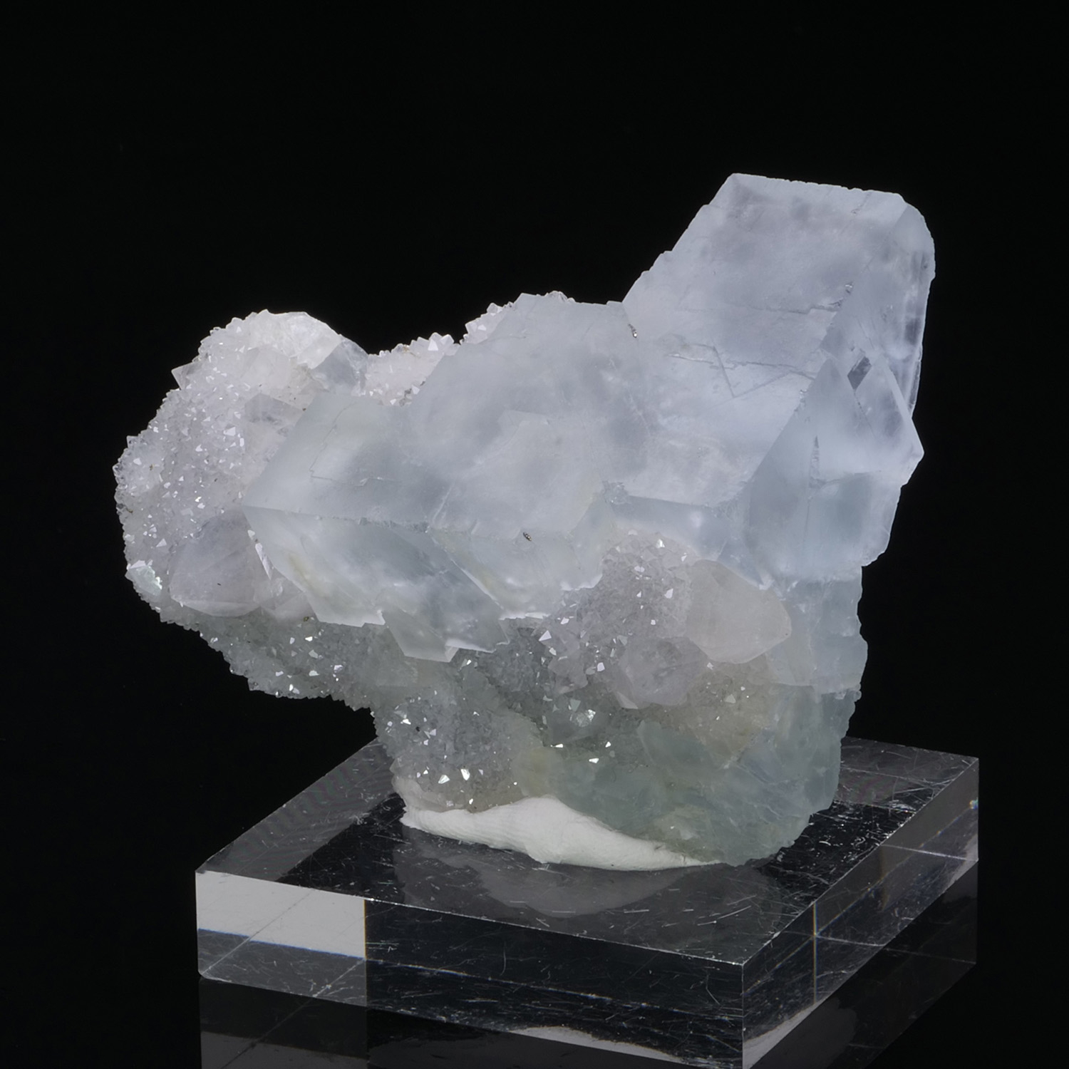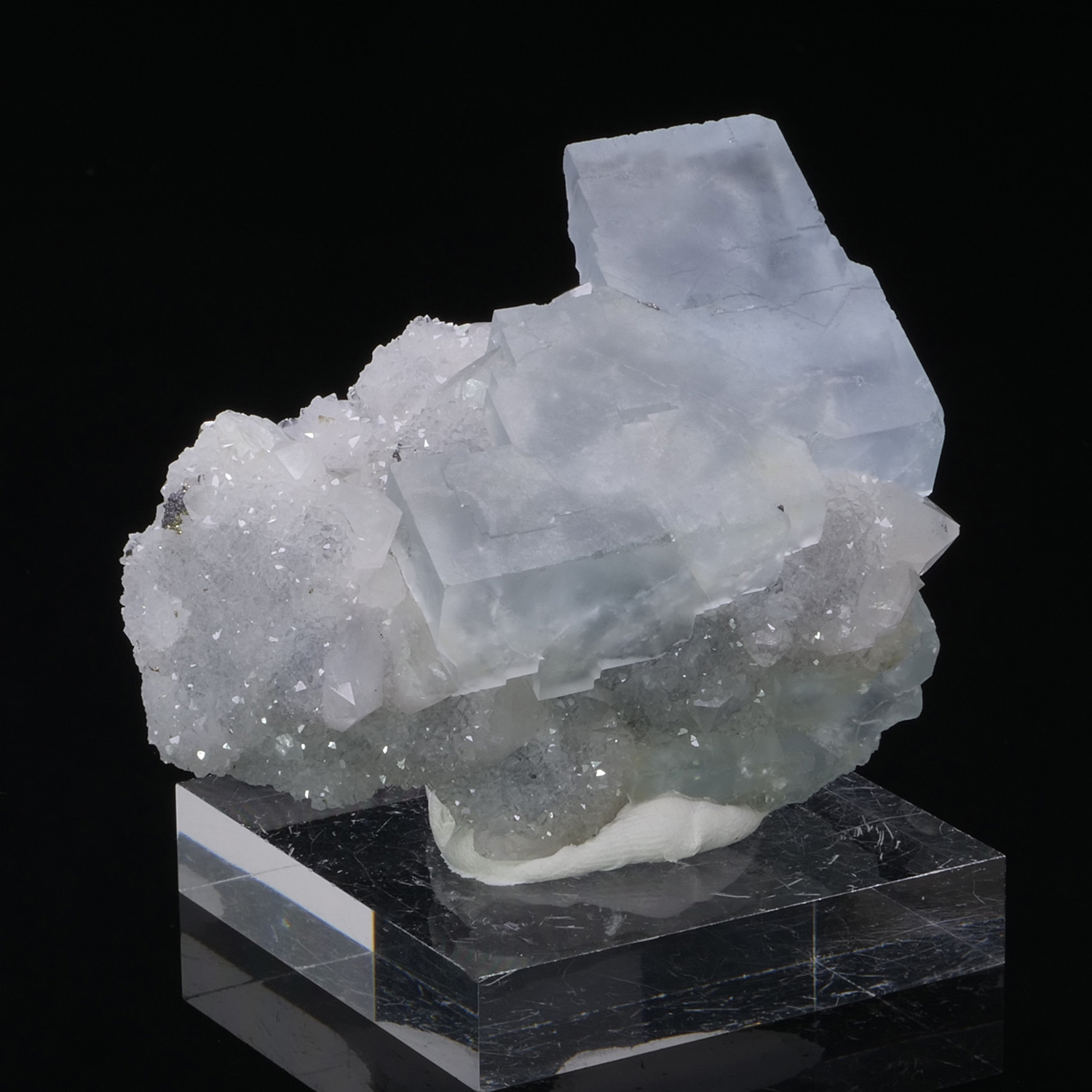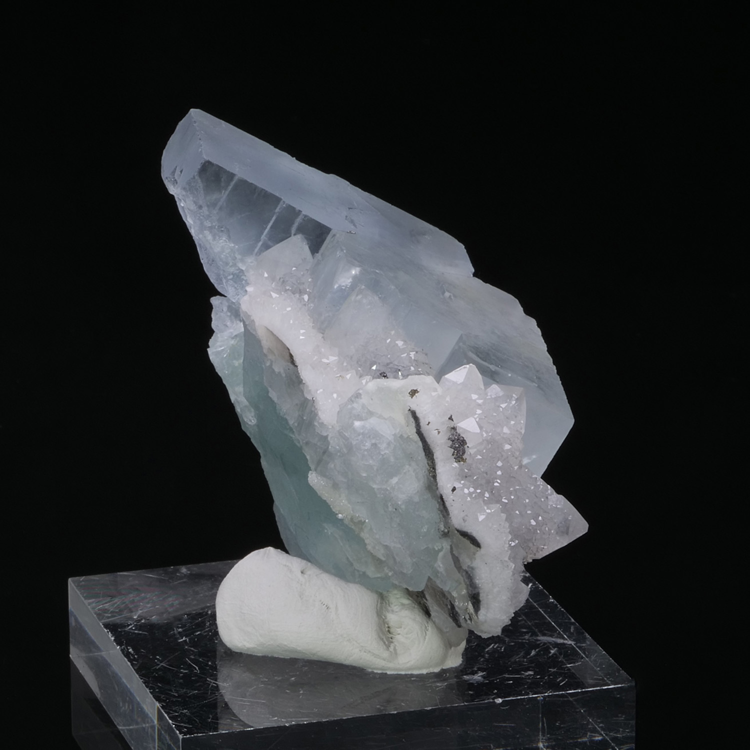 Exceptional specimen from the internationally renowned Burg mine, presenting a large light blue cube intimately associated with a shiny pyramidal quartz. An emblematic piece of French mineralogy.