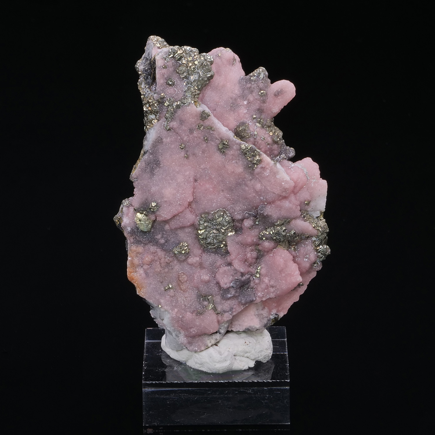 Superb specimen of Rhodochrosite pseudomorphosed after Calcite, that is to say that Rhodochrosite replaced Calcite, associated with Pyrite. This piece comes from the Oppu mine in Japan, a locality known worldwide for having superb and rare specimens of Rhodochrosite. This one is very impressive due to its crystallization and the color is really sublime. Beautiful shine for this Japanese piece.