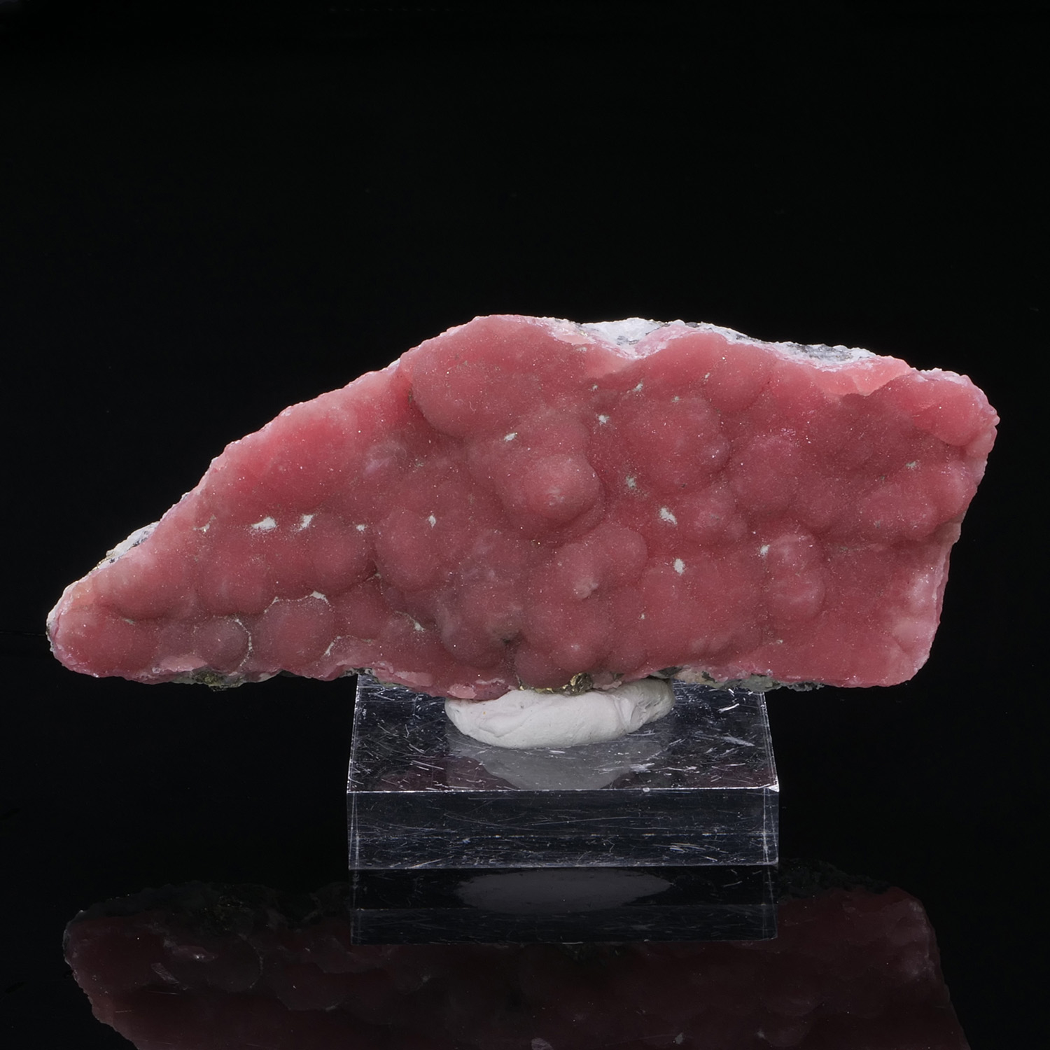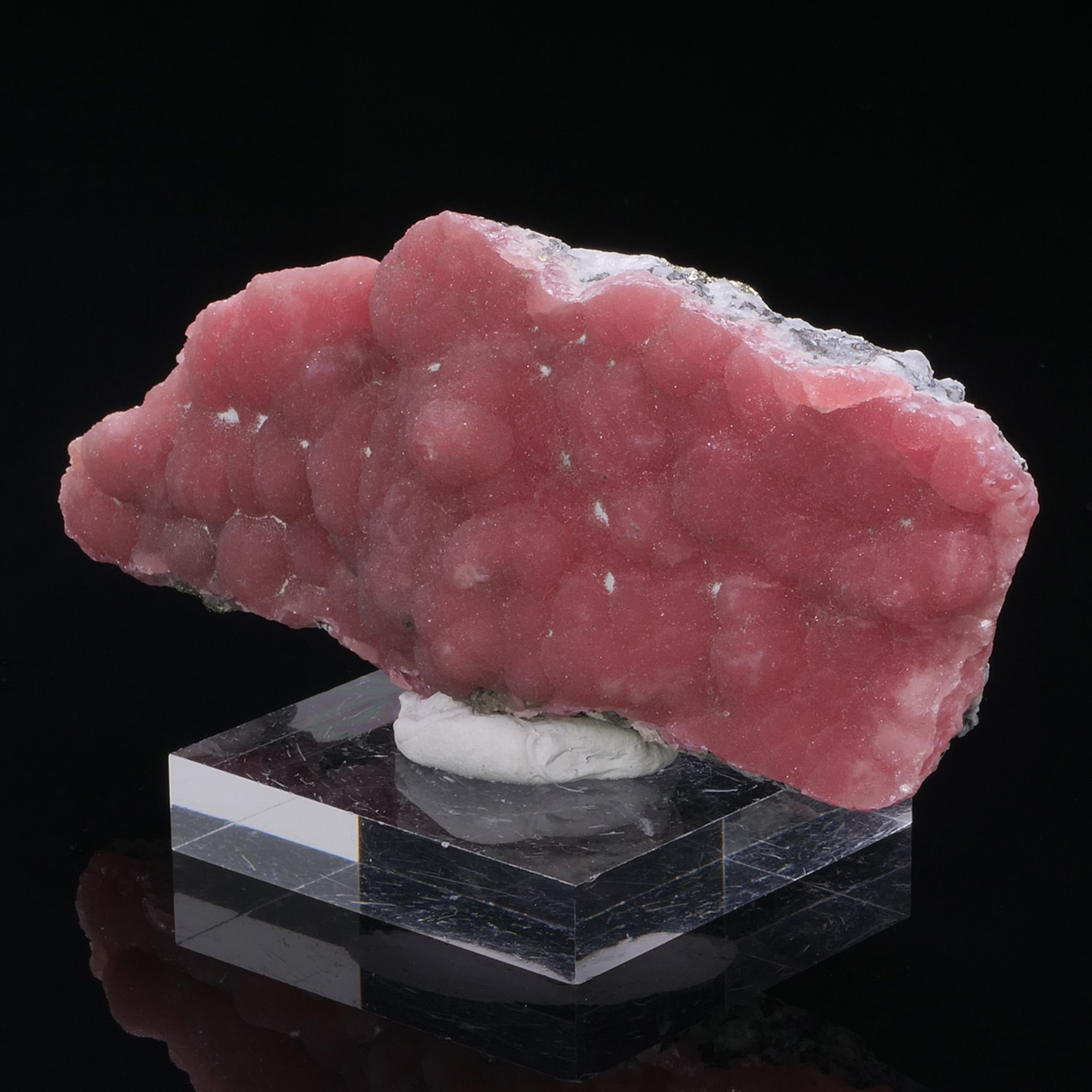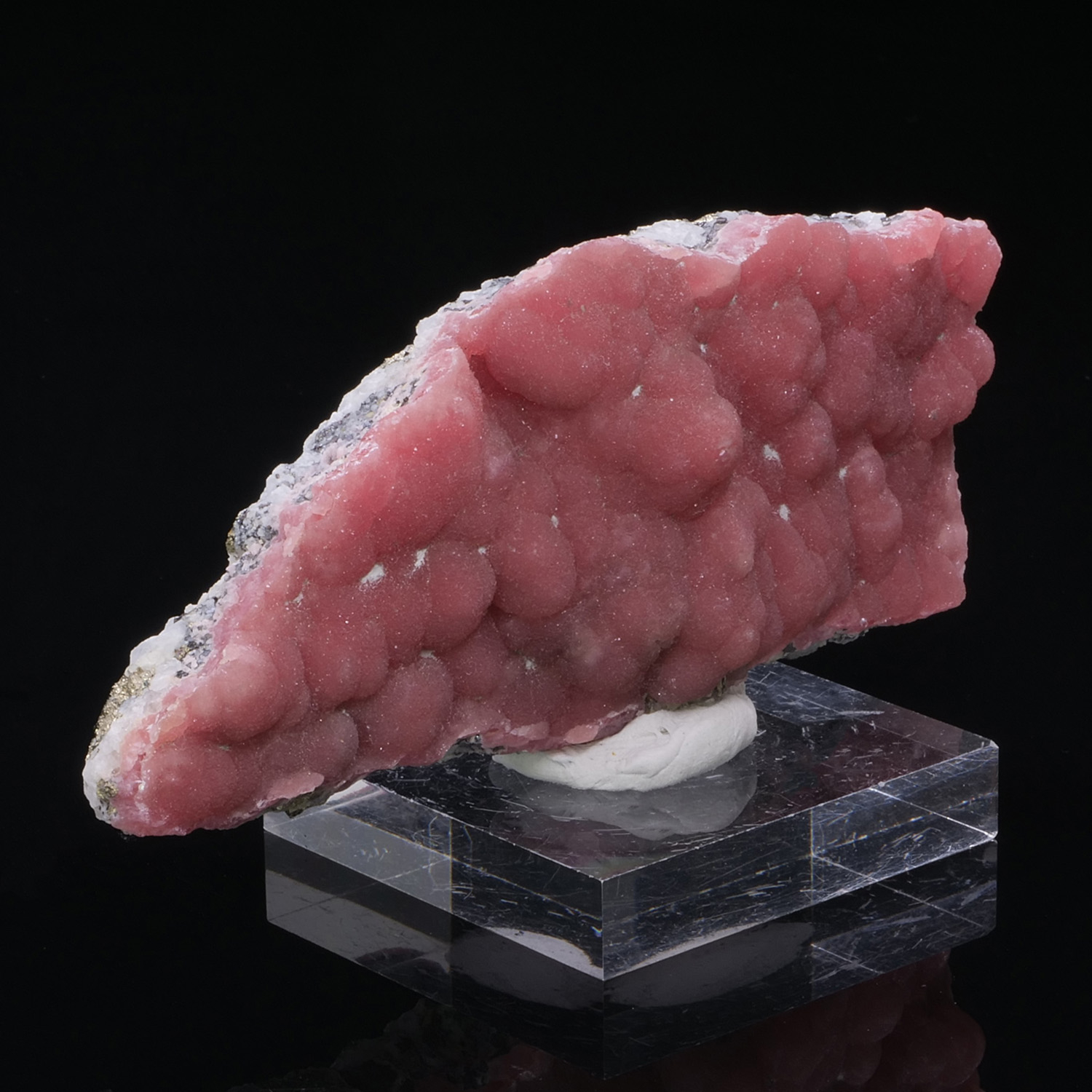 Superb Rhodochrosite from Japan, the Oppu mine. Besides its splendid pink color, the crystallization is superb. On the back of the piece, the matrix of Quartz and Pyrite is clearly visible. Botryoidal Rhodochrosite, it is a very beautiful formation and it is rare to find such beautiful ones.