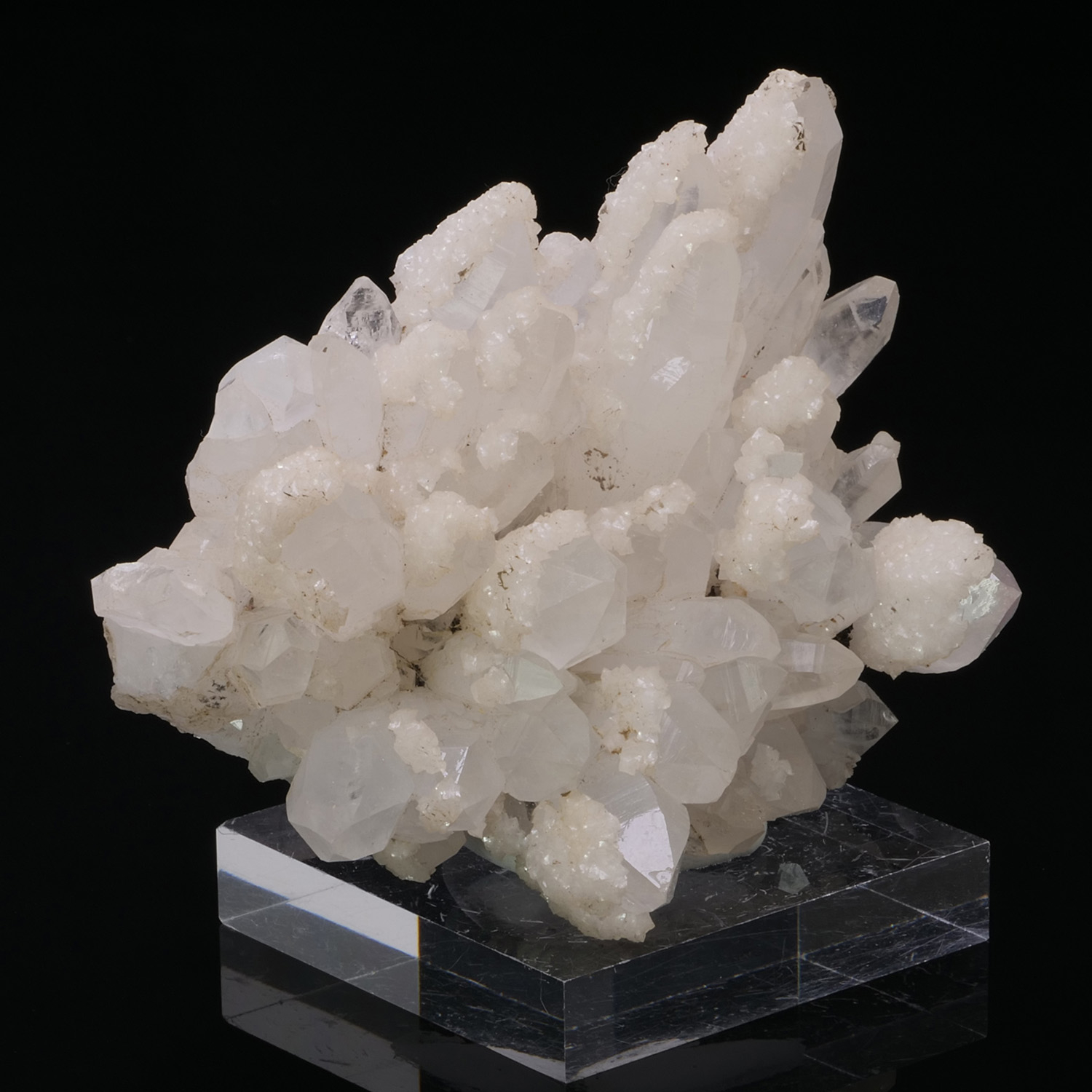 Quartz Clusters surmounted by calcite crystals and some touches of Galena at the level of the Quartz base. Specimen from Trepca in Kosovo.