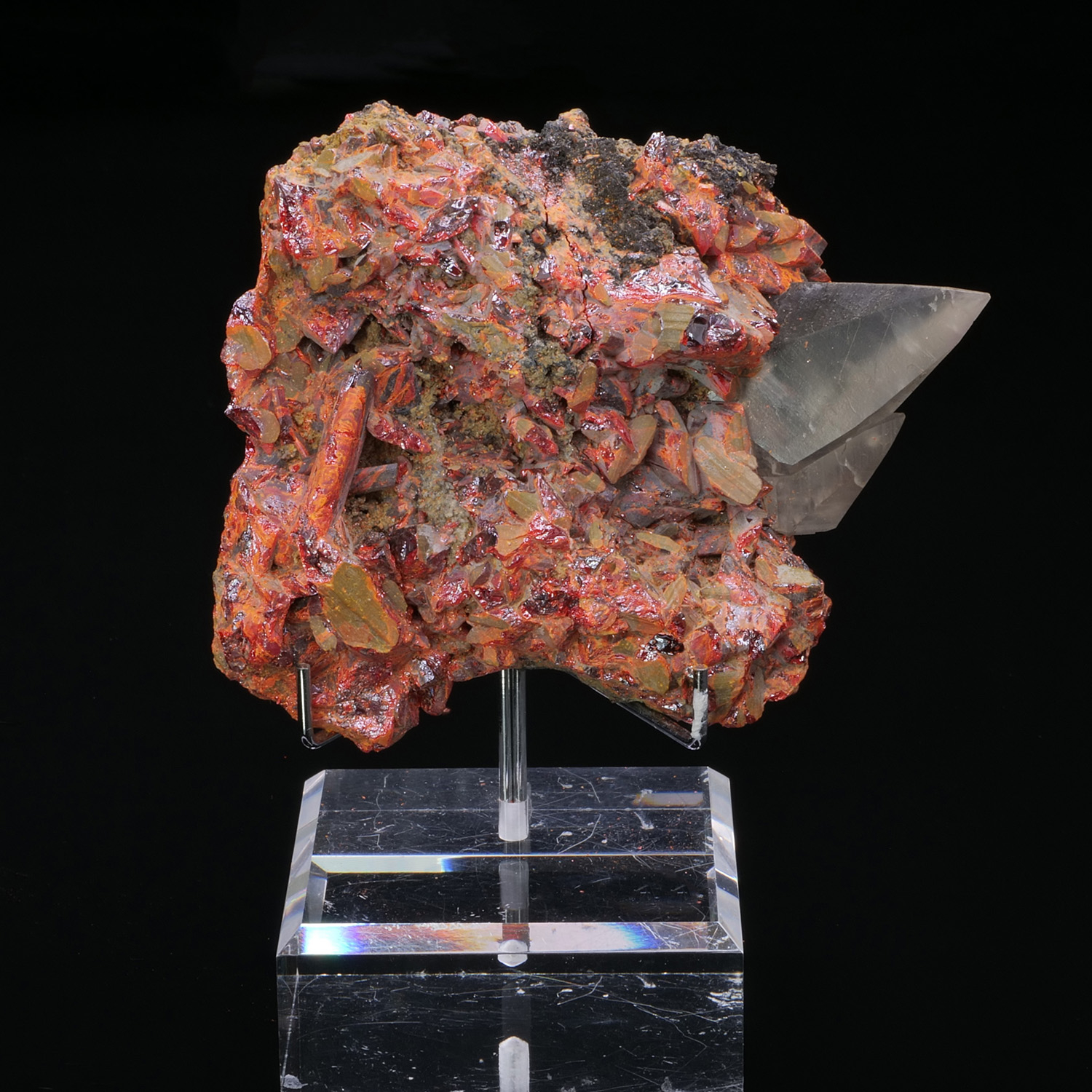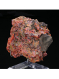 Very fragile Realgar crystals, combined with well-formed grey calcite crystals from the Jiepaiyu mine in China.