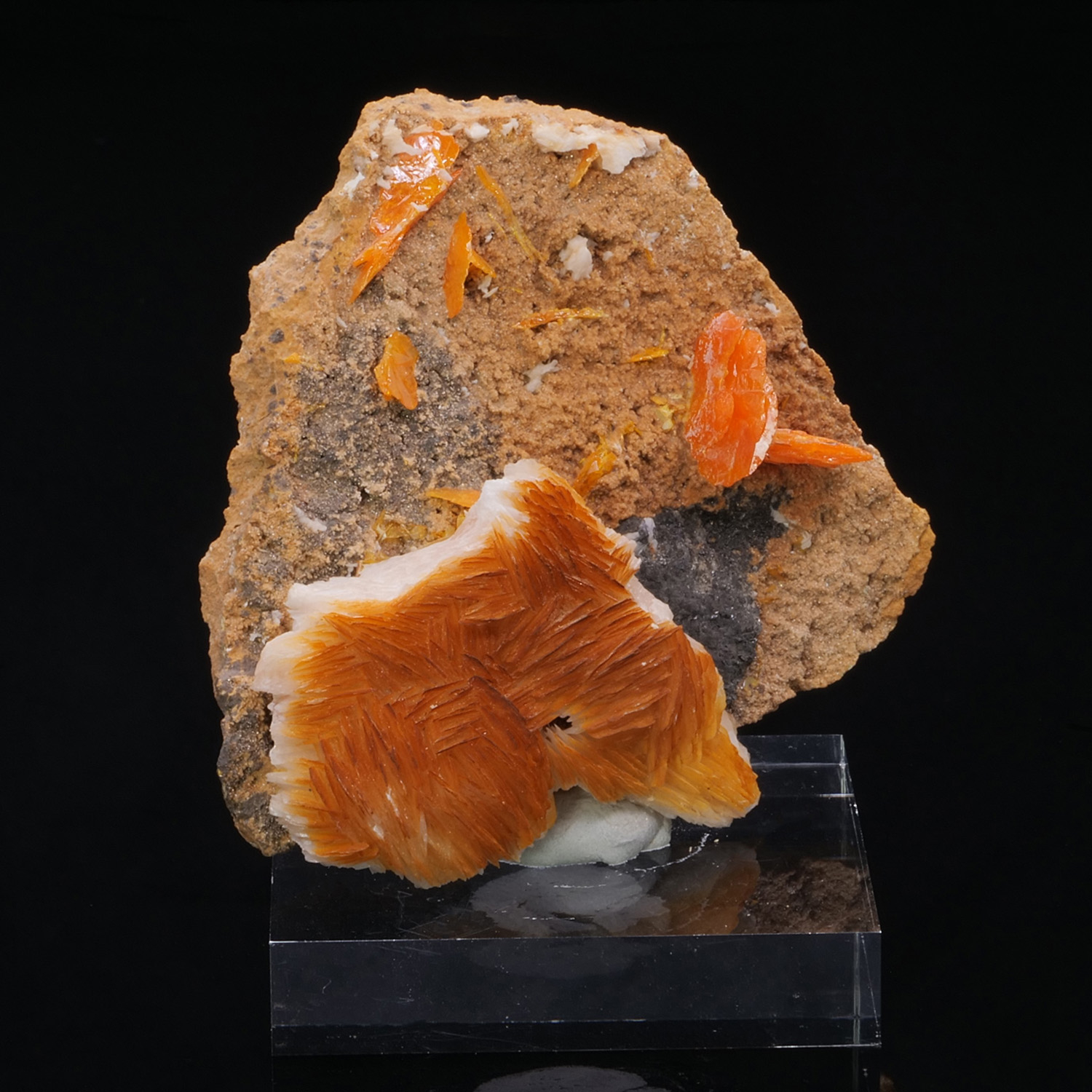 Crystals of intense orange Wulfenite associated with typical Baryte from Mibladen in Morocco.