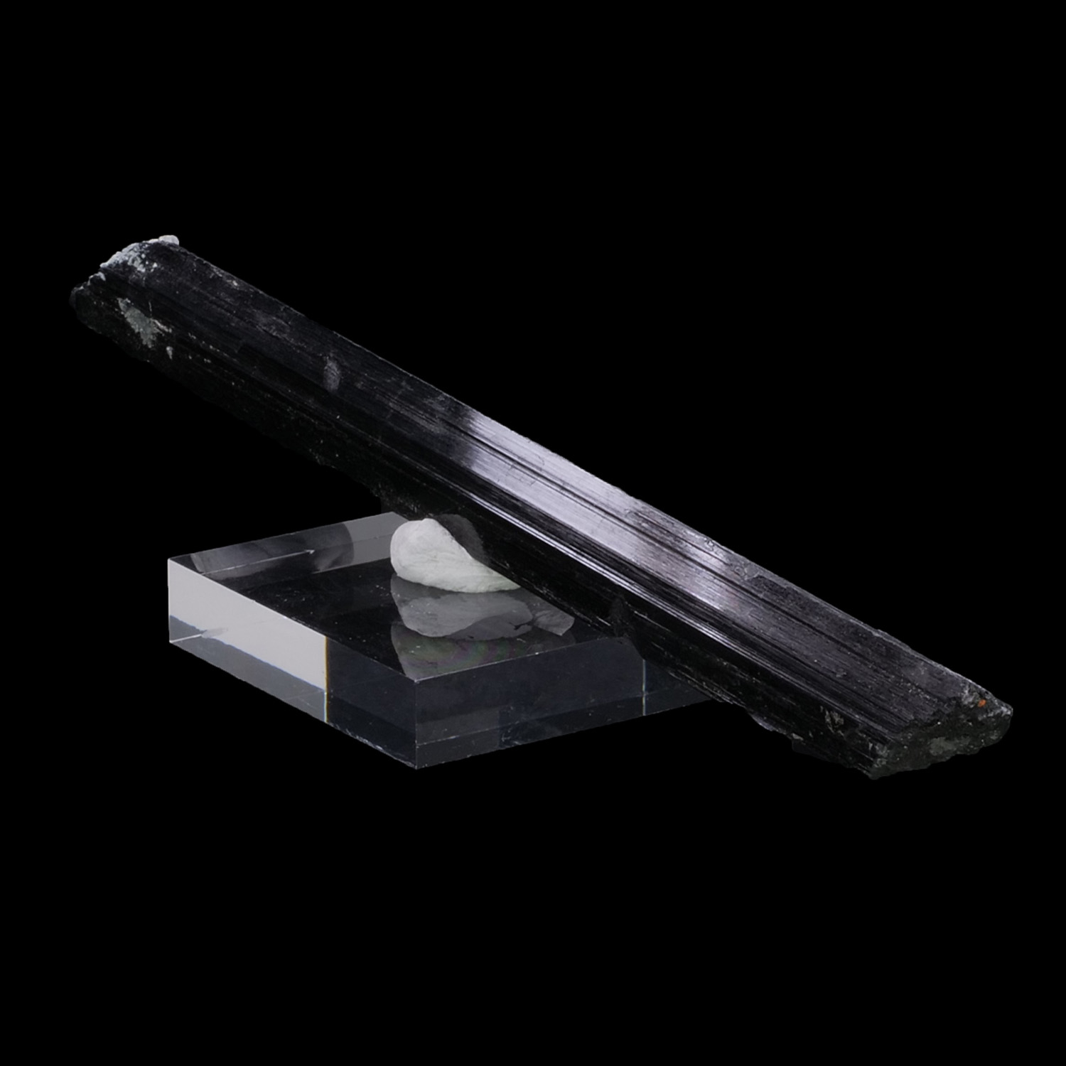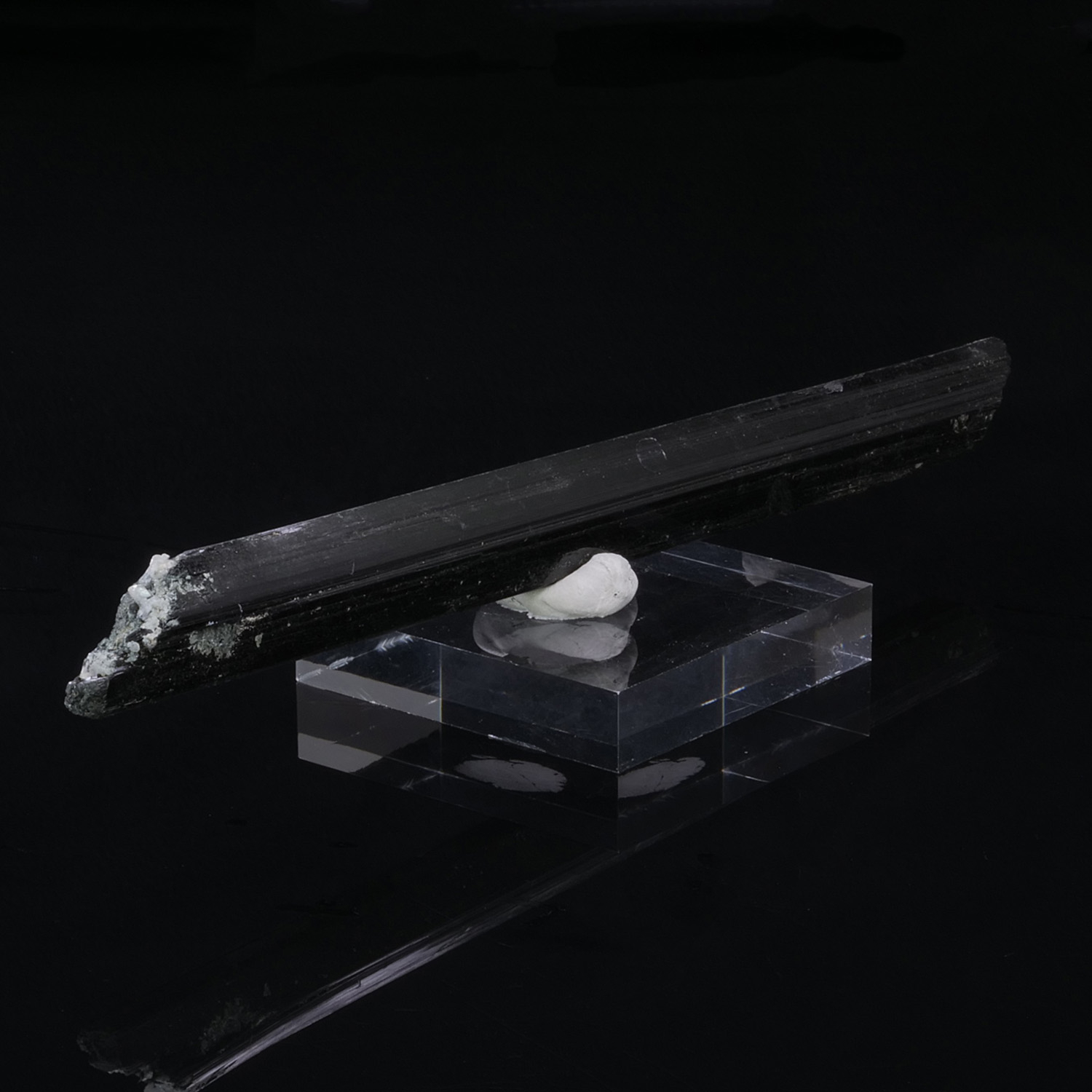 Very long Ferro Actinolite crystal from Shigar in Pakistan. The color is black and shiny, very beautiful collection specimen.