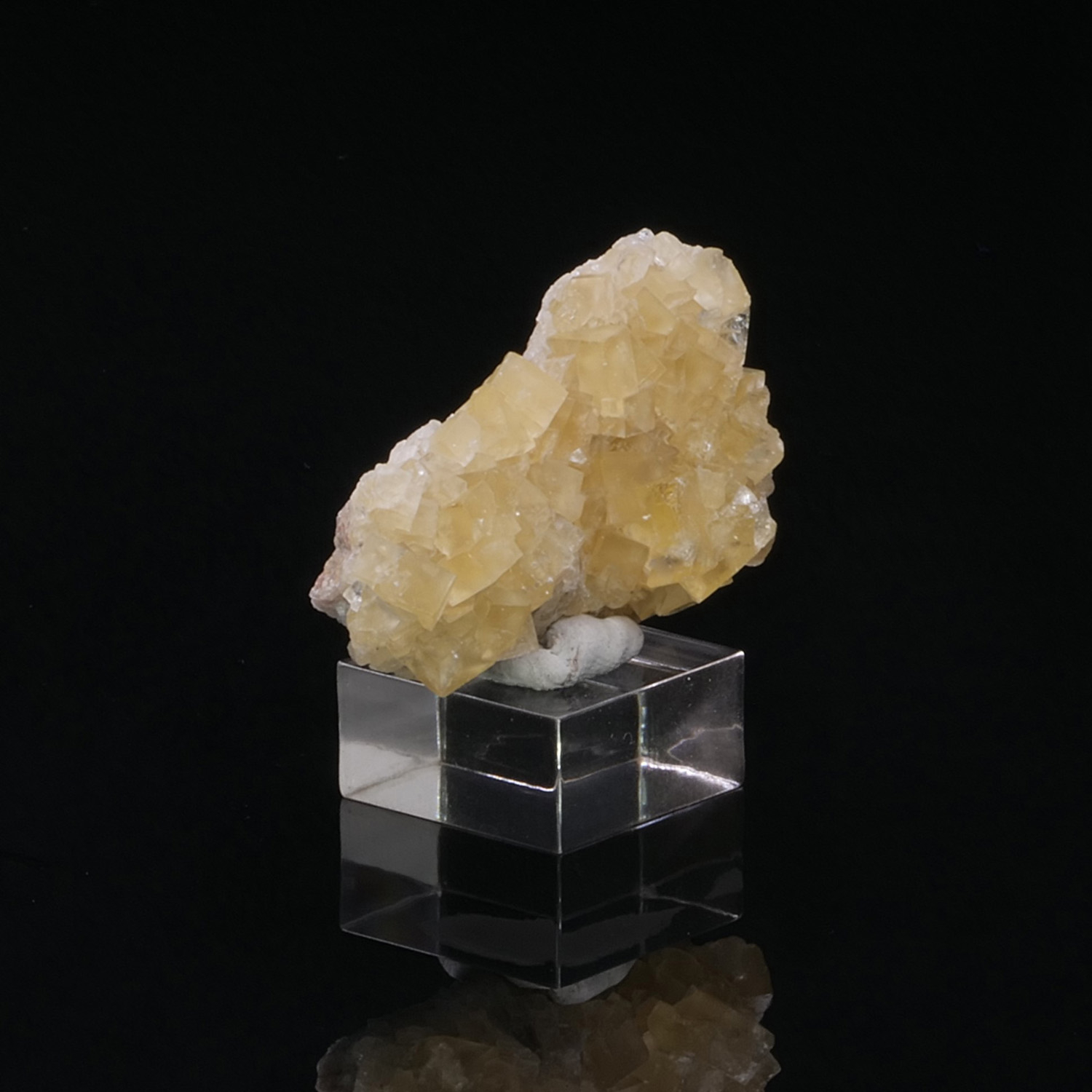 Shiny yellow fluorite cubes. The color is intense, beautiful quality for this miniature from Giromagny in France. Small crystals of Galena are found on the sides and back of the piece.