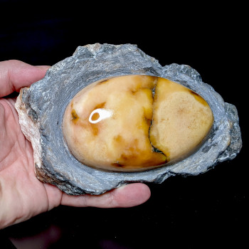 Pièce provenant de la mine de Mâlain en Bourgogne, France, mettant en valeur un nodule de gypse de couleur saumonée.Cette mine, maintenant interdite d'accès, contient de rares formations en nodule prises dans une marne argileuse.Ces nodules peuvent être patiemment dégagés de leur gangue, polis et...