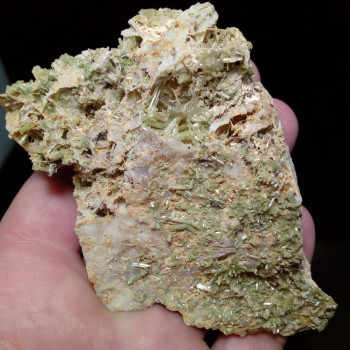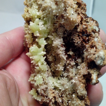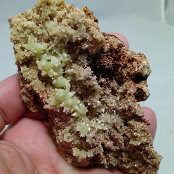 Cristaux de Pyromorphite jaune/vert au faciès particulier. Les cristaux forment des "touffes", et certains individus portent des excroissances en "touffes". Très original !12 x 7,5 x 3,5 cmRéférence : 0095