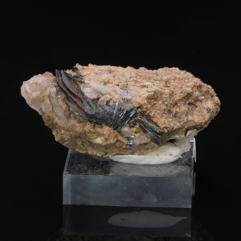 Grand cristal d’Hübnérite noir associé à des pointes de Quartz qui apportent de la brillance et de la lumière au spécimen. Pièce provenant de la mine Mundo Nuevo au Pérou.4,20 x 3,80 x 2,80 cmRéférence : 4139