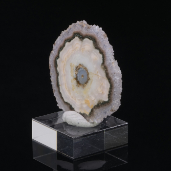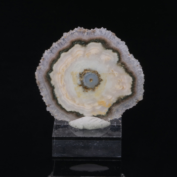 Tranche de stalactite de Calcédoine et Quartz recouverte par de l’Améthyste en extérieur, provenant de Ametista do Sul au brésil.4,70 x 4,60 x 0,30 cmRéférence : 4161