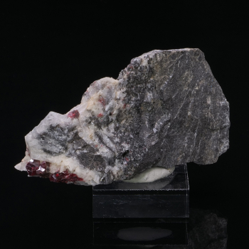 Scalénoèdres de Rhodochrosite rouge sur Manganite noire brillant qui donne un superbe contraste de couleur. Taille Cabinet, cette pièce est très homogène de par les nombreux cristaux de Rhodochrosite très bien formés à la couleur intense.10,50 x 6,20 x 4,20 cmRéférence : 4037