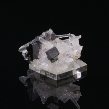 Très beaux cristaux d’Hübnérite noire aux reflets rouge briques sur Quartz offrant un beau contraste. Spécimen provenant de la mine Mundo Nuevo au Pérou.4,60 x 3,80 x 2 cmRéférence : 4166