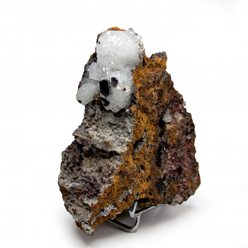 Étonnante structure limoniteuse portant des gerbes de cristaux d'hémimorphite brillante dont le plus gros pompon mesure 4,7 cm.Ce minéral provient de la mine d'Ojuela, Mapimi, Durango, Mexique.Il mesure 9,5 cm au plus haut pour 7,4 cm de large et 4,6 cm d'épaisseur.Son poids est de 337...