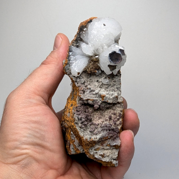 Superbe association provenant de la mine de Wessels en Afrique du Sud. On y trouve des cristaux aciculaires d’Inésite orange saumon sur toutes les faces de la pièce, avec des cristaux de Natrolite blancs transparents sous forme de longues baguettes (très beaux cristaux !) puis de...