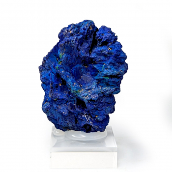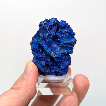 Azurite présentant plusieurs nuances de bleu, contrastée par un peu de gangue ocre et de malachite.Elle provient de Kimbwé, district Kinsevere, Katanga, Congo.Cette pièce mesure 5,1 cm de haut pour 4,1 cm de large et 2,4 cm d'épaisseur.Son poids est de 60 grammes.(Mesures hors socle). Photos...