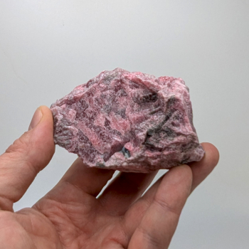 Pièce de pyroxmangite partiellement cristallisée de couleur rose.Ce silicate ayant la même composition chimique que celle de la rhodonite provient de la mine Morro da mina, Conselheiro Lafaiete, Brésil.Il mesure 7,2 cm de long pour 5,4 cm de large et 4,5 cm d'épaisseur.Échantillon d'un poids de...
