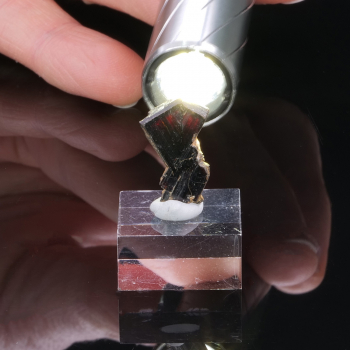 Les pegmatites d’Alto Ligonha au Mozambique ont livrés de superbes cristaux de Tantalite-Mn dont ceux-ci qui sont gemmes et maclés ! La lumière par rétroéclairage fait ressortir la couleur rouge cerise intense de ces cristaux gemmes parfaitement cristallisés avec une belle macle. Cristaux...