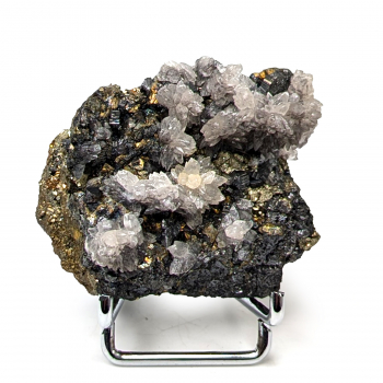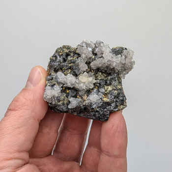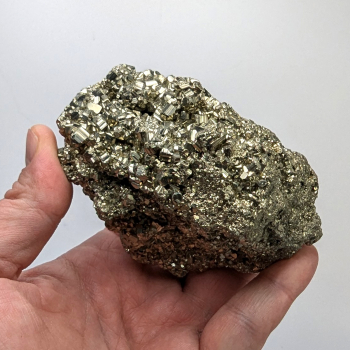 Pyrite péruvienne avec une cristallisation brillante sur une gangue de pyrite massive.Elle provient de la mine de Huanzala, Huallanca, Ancash, Pérou.Cet échantillon mesure 9,8 cm de long pour 6,7 cm de large et 4,5 cm d'épaisseur.Son poids est de 471 grammes.Photos supplémentaires et commande en...