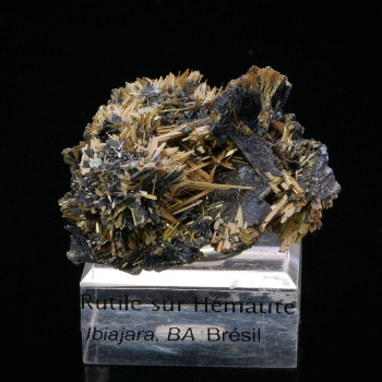 Superbe pièce du Brésil présentant des cristaux de Rutile doré en épitaxie sur Hématite miroir noire. Les cristaux de Rutile paraissent duveteux et forment vraiment comme une chevelure sur l’Hématite.5,10 x 4,30 x 3,30 cmRéférence : 3746