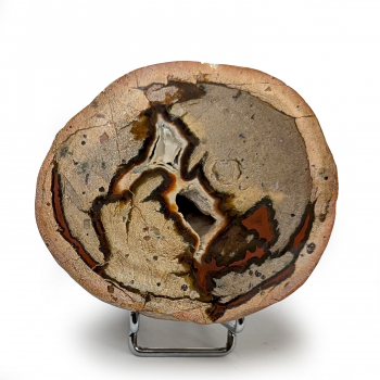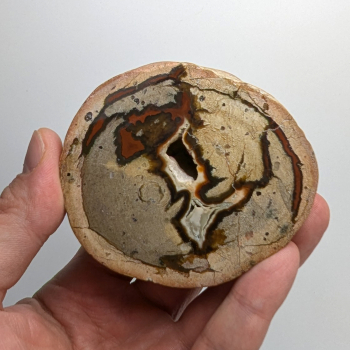 Demie lithophyse polie, beige avec liserés rouges, présentant une géode en son centre.Ce spécimen provient de la Vallée du Lierbach, Région de Fribourg, Bade-Wurtemberg, Allemagne.Pièce mesurant 7,6 cm de long pour 6,6 cm de large et 3,6 cm d'épaisseur.Elle pèse 231 grammes. Photos...