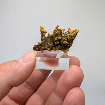 Bel échantillon provenant du district de Santa Eulalia, municipalité de Aquiles Serdan, Chihuahua, Mexique.Il s'agit de mimémite sur matrice d'oxydes surmontée de cristaux de wulfénite jaune.Ce minéral mesure 10 cm de long pour 9 cm de large et 3,8 cm d'épaisseur.Son poids est de 351...