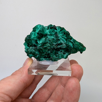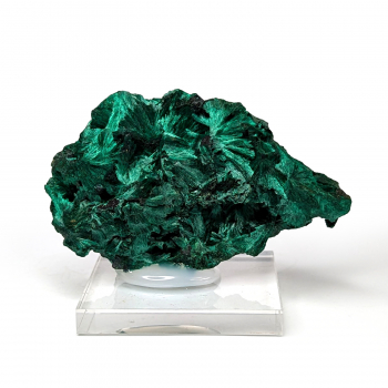Malachite brillante, avec une cristallisation en fibres de couleur vive d'un côté et un aspect plus sombre de l'autre côté.Cette pièce provient de Mindigi, dans la région du Haut Katanga au Congo.Elle mesure 6,4 cm de haut pour 3,7 cm de large et 2,5 cm d'épaisseur.Son poids est de 54...