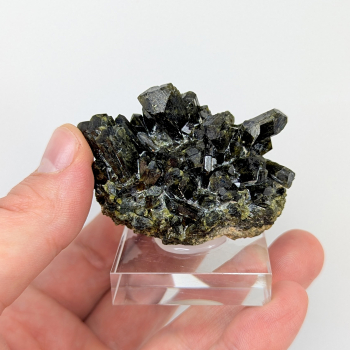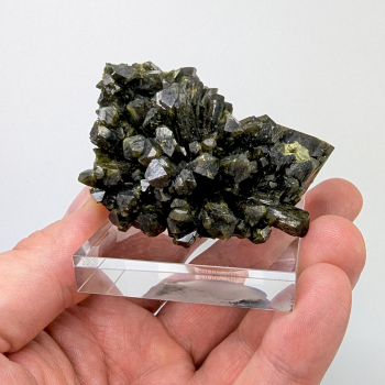 Cristaux terminés d'épidote de couleur vert foncé sur une gangue d'épidote massive.Cette pièce provient de Pampa Blanca, département d'Ica, au Pérou.Elle mesure 5,8 cm de long pour 3,5 cm de haut et 4,5 cm d'épaisseur.Son poids est de 127 grammes. (Mesures hors socle)Photos supplémentaires et...