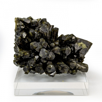 Groupe de cristaux terminés d'épidote de couleur vert foncé sur une gangue d'épidote massive.Cette pièce provient de Pampa Blanca, département d'Ica, au Pérou.Elle mesure 5,6 cm de long pour 4,1 cm de haut et 3,9 cm d'épaisseur.Son poids est de 94 grammes. (Mesures hors socle)Photos...