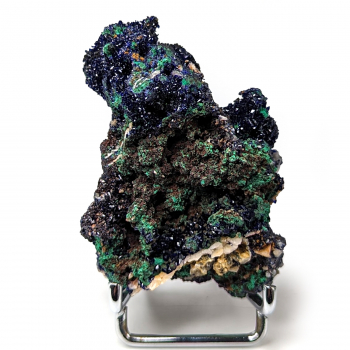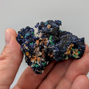 Échantillon d'azurite finement cristallisée avec une couleur bleue rehaussée par les couleurs de la gangue et de la malachite. Il provient du district minier d'Oumjrane, Province de Tinghir, Région du Drâa-Tafilalet, Maroc. Cette azurite mesure 5,3 cm de long pour 4,5 cm de haut et 2,7 cm de...