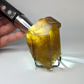 Cristal partiel de baryte couleur miel, transparent, avec une brillance correcte. Il provient du secteur d'Olloix, Puy-de-Dôme, Auvergne-Rhône-Alpes, France.Cet échantillon mesure 8,4 cm de haut pour 6 cm de large et 3,5 cm d'épaisseur. Son poids est de 318 grammes. Photos supplémentaires et...