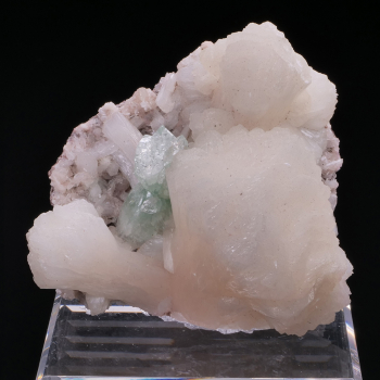 Fleur d’Apophyllite verte aux cristaux terminés et bien formés dans son écrin de cristaux de Stilbite rose très pâle. Ce spécimen est mis en valeur par son socle sur-mesure réalisé par nos soins.9 x 7,70 x 5,90 cmRéférence : 3132