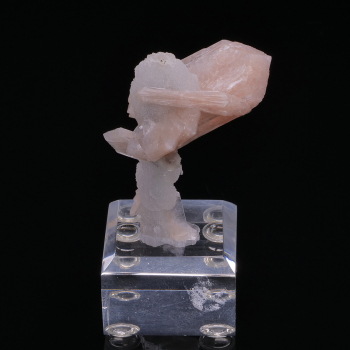 Spécimen aérien présentant des cristaux de Stilbite rose saumon sur Calcédoine bleuté, le tout mis en valeur par son socle sur-mesure.12,80 x 4,60 x 4,20 cmRéférence : 3112